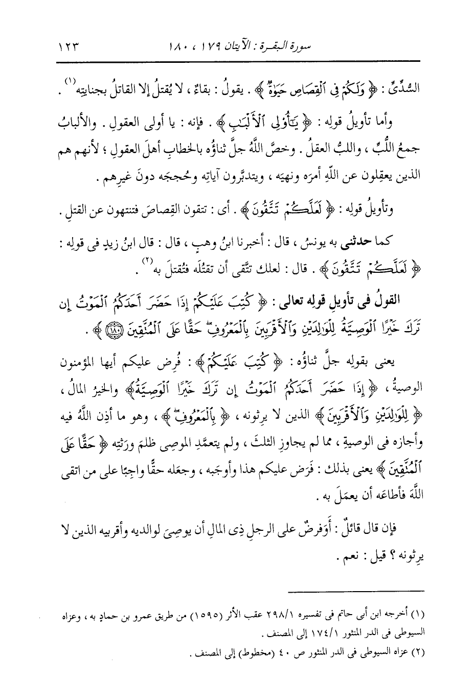 §يَعْنِي بِقَوْلِهِ تَعَالَى ذِكْرُهُ {كُتِبَ عَلَيْكُمْ} [البقرة: 178] فُرِضَ عَلَيْكُمْ أَيُّهَا الْمُؤْمِنُونَ الْوَصِيَّةُ إِذَا حَضَرَ أَحَدَكُمُ الْمَوْتُ {إِنْ تَرَكَ خَيْرًا} [البقرة: 180] وَالْخَيْرُ: الْمَالُ {لِلْوَالِدَيْنِ وَالْأَقْرَبِينَ} [البقرة: 180] الَّذِينَ لَا يَرِثُونَهُ، {بِالْمَعْرُوفِ} [البقرة: 178] وَهُوَ مَا أَذِنَ اللَّهُ فِيهِ وَأَجَازَهُ فِي الْوَصِيَّةِ مِمَّا لَمْ يُجَاوِزِ الثُّلُثَ، وَلَمْ يَتَعَمَّدِ الْمُوصِي ظُلْمَ وَرَثَتِهِ {حَقًّا عَلَى الْمُتَّقِينَ} [البقرة: 180] يَعْنِي بِذَلِكَ: فُرِضَ عَلَيْكُمْ هَذَا وَأَوْجَبَهُ، وَجَعَلَهُ حَقًّا وَاجِبًا عَلَى مَنِ اتَّقَى اللَّهَ فَأَطَاعَهُ أَنْ يَعْمَلَ بِهِ. فَإِنْ قَالَ قَائِلٌ: أَوْ فُرِضَ عَلَى الرَّجُلِ ذِي الْمَالِ أَنْ يُوصِيَ لِوَالِدَيْهِ وَأَقْرَبِيهِ الَّذِينَ لَا يَرِثُونَهُ؟ قِيلَ: نَعَمْ.