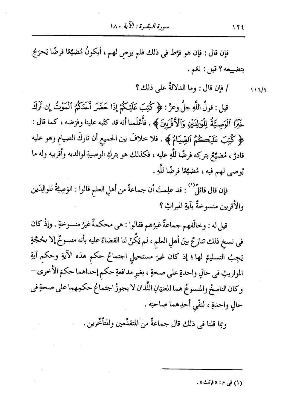فَإِنْ قَالَ: فَإِنْ هُوَ فَرَّطَ فِي ذَلِكَ فَلَمْ يُوصِ لَهُمْ أَيَكُونُ مُضَيَّعًا فَرْضًا يُحْرَجُ بِتَضْيِيعِهِ؟ قِيلَ: نَعَمْ. فَإِنْ قَالَ: وَمَا الدَّلَالَةُ عَلَى ذَلِكَ؟ قِيلَ: قَوْلُ اللَّهِ تَعَالَى ذِكْرُهُ: {كُتِبَ عَلَيْكُمْ إِذَا حَضَرَ أَحَدَكُمُ الْمَوْتُ إِنْ تَرَكَ خَيْرًا الْوَصِيَّةُ لِلْوَالِدَيْنِ وَالْأَقْرَبِينَ} [البقرة: 180] فَأَعْلَمَ أَنَّهُ قَدْ كَتَبَهُ عَلَيْنَا وَفَرَضَهُ، كَمَا قَالَ: {كُتِبَ عَلَيْكُمُ الصِّيَامُ} [البقرة: 183] وَلَا خِلَافَ بَيْنَ الْجَمِيعِ أَنَّ تَارِكَ الصِّيَامِ وَهُوَ عَلَيْهِ قَادِرٌ مُضَيِّعٍ بِتَرْكِهِ فَرْضًا لِلَّهِ عَلَيْهِ، فَكَذَلِكَ هُوَ بِتَرْكِ الْوَصِيَّةِ لِوَالِدَيْهِ وَأَقْرَبِيهِ وَلَهُ مَا يُوصِي لَهُمْ فِيهِ، مُضَيِّعٌ فَرْضَ اللَّهِ عَزَّ وَجَلَّ. فَإِنْ قَالَ: فَإِنَّكَ قَدْ عَلِمْتَ أَنَّ جَمَاعَةً مِنْ أَهْلِ الْعِلْمِ قَالُوا: {الْوَصِيَّةُ لِلْوَالِدَيْنِ وَالْأَقْرَبِينَ} [البقرة: 180] مَنْسُوخَةٌ بِآيَةِ الْمِيرَاثِ؟ قِيلَ لَهُ: وَخَالَفَهُمْ جَمَاعَةٌ غَيْرَهُمْ فَقَالُوا: هِيَ مُحْكَمَةٌ غَيْرُ مَنْسُوخَةٍ: وَإِذَا كَانَ فِي نَسْخِ ذَلِكَ تَنَازُعٌ بَيْنَ أَهْلِ الْعِلْمِ لَمْ يَكُنْ لَنَا الْقَضَاءُ عَلَيْهِ بِأَنَّهُ مَنْسُوخٌ إِلَّا بِحُجَّةٍ يَجِبُ التَّسْلِيمُ لَهَا، إِذْ كَانَ غَيْرَ مُسْتَحِيلٍ اجْتِمَاعُ حُكْمِ هَذِهِ الْآيَةِ وَحُكْمِ آيَةِ الْمَوَارِيثِ فِي حَالٍ وَاحِدَةٍ عَلَى صِحَّةٍ بِغَيْرِ مُدَافَعَةِ حُكْمِ إِحْدَاهُمَا حُكْمَ الْأُخْرَى وَكَانَ النَّاسِخُ وَالْمَنْسُوخُ هُمَا الْمَعْنَيَانِ اللَّذَانِ لَا يَجُوزُ اجْتِمَاعُ حُكْمُهُمَا عَلَى صِحَّةٍ فِي حَالَةٍ وَاحِدَةٍ لِنَفْيِ أَحَدِهِمَا صَاحِبَهُ. وَبِمَا قُلْنَا فِي ذَلِكَ قَالَ جَمَاعَةٌ مِنَ الْمُتَقَدِّمِينَ وَالْمُتَأَخِّرِينَ