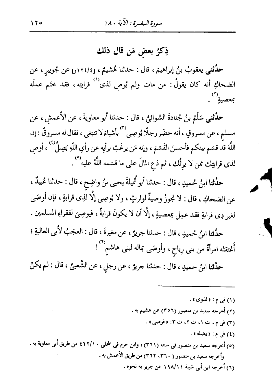 ذِكْرُ مَنْ قَالَ ذَلِكَ حَدَّثَنِي يَعْقُوبُ بْنُ إِبْرَاهِيمَ، قَالَ: ثنا هُشَيْمٌ، عَنْ جُوَيْبِرٍ، عَنِ الضَّحَّاكِ، أَنَّهُ كَانَ يَقُولُ «§مَنْ مَاتَ وَلَمْ يُوصِ لِذَوِي قَرَابَتِهِ فَقَدْ خَتَمَ عَمَلُهُ بِمَعْصِيَةٍ»