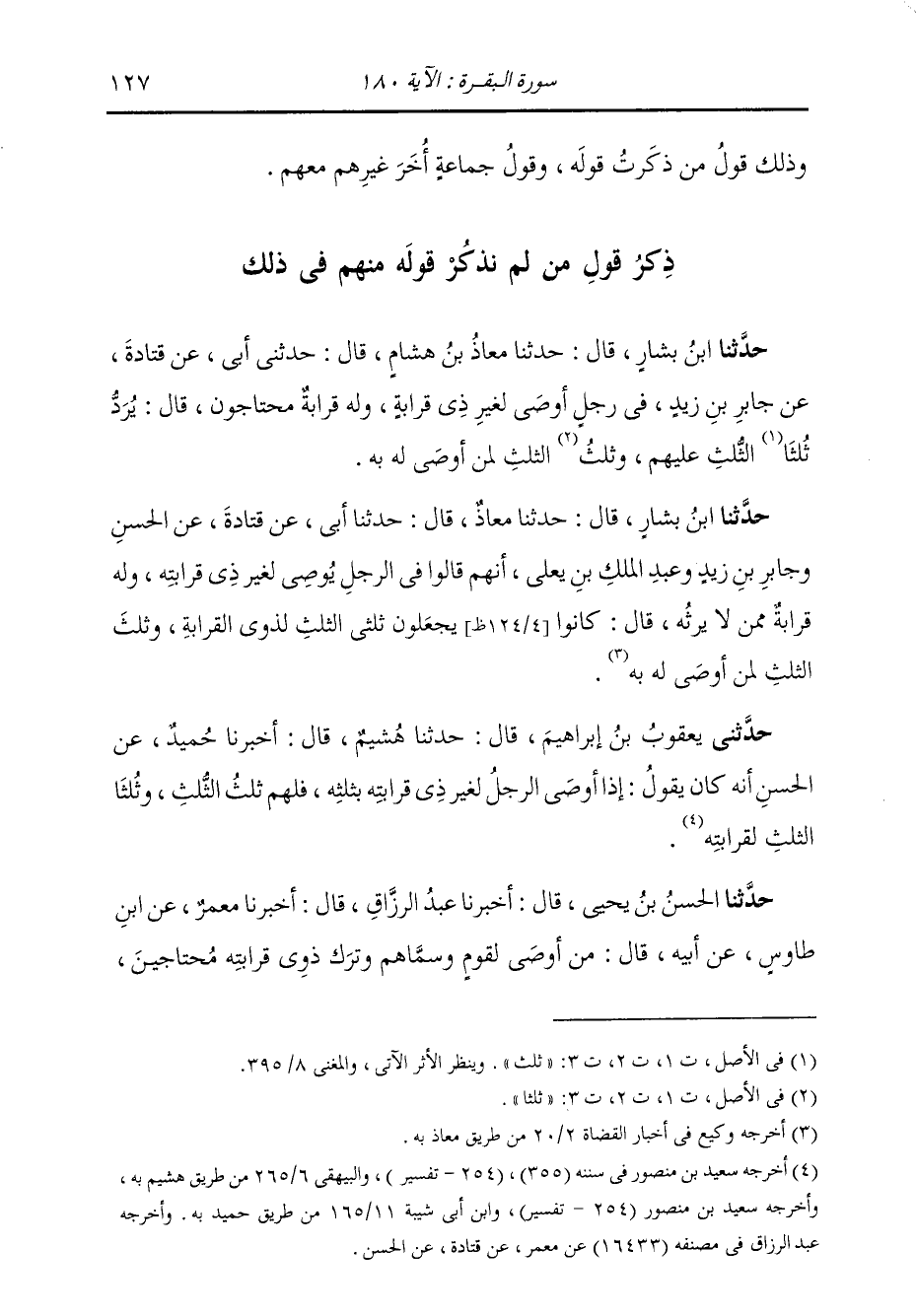 حَدَّثَنَا الْحَسَنُ بْنُ يَحْيَى، قَالَ: أَخْبَرَنَا عَبْدُ الرَّزَّاقِ، قَالَ: أَخْبَرَنَا مَعْمَرٌ، عَنِ ابْنِ طَاوُسٍ، عَنْ أَبِيهِ، قَالَ «§مَنْ أَوْصَى لِقَوْمٍ وَسَمَّاهُمْ وَتَرَكَ ذَوِي قَرَابَتِهِ مُحْتَاجِينَ -[128]- انتُزِعَتْ مِنْهُمْ وَرُدَّتْ إِلَى ذَوِي قَرَابَتِهِ» وَقَالَ آخَرُونَ: بَلْ هِيَ آيَةٌ قَدْ كَانَ الْحُكْمُ بِهَا وَاجِبًا وَعُمِلَ بِهِ بُرْهَةً ثُمَّ نَسَخَ اللَّهُ مِنْهَا بِآيَةِ الْمَوَارِيثِ الْوَصِيَّةَ لِوَالِدَيِ الْمُوصِي وَأَقْرِبَائِهِ الَّذِينَ يَرِثُونَهُ، وَأَقَرَّ فَرْضَ الْوَصِيَّةِ لِمَنْ كَانَ مِنْهُمْ لَا يَرِثُهُ