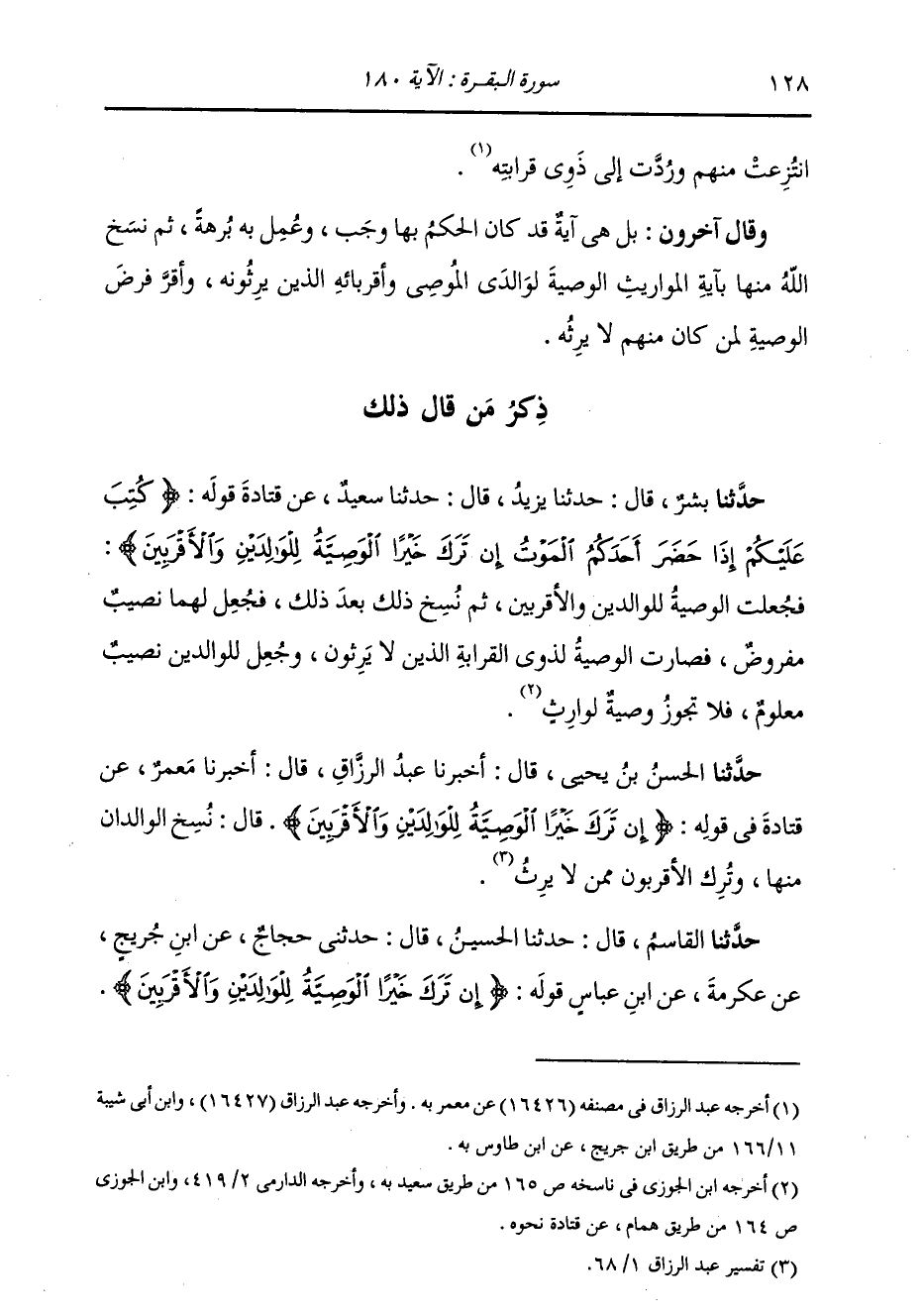 حَدَّثَنَا الْحَسَنُ بْنُ يَحْيَى، قَالَ: أَخْبَرَنَا عَبْدُ الرَّزَّاقِ، قَالَ: أَخْبَرَنَا مَعْمَرٌ، عَنْ قَتَادَةَ، فِي قَوْلِهِ: {§إِنْ تَرَكَ خَيْرًا الْوَصِيَّةُ لِلْوَالِدَيْنِ وَالْأَقْرَبِينَ} [البقرة: 180] قَالَ «نُسِخَ الْوَالِدَانِ مِنْهَا، وَتُرِكَ الْأَقْرَبُونَ مِمَّنْ لَا يَرِثُ»