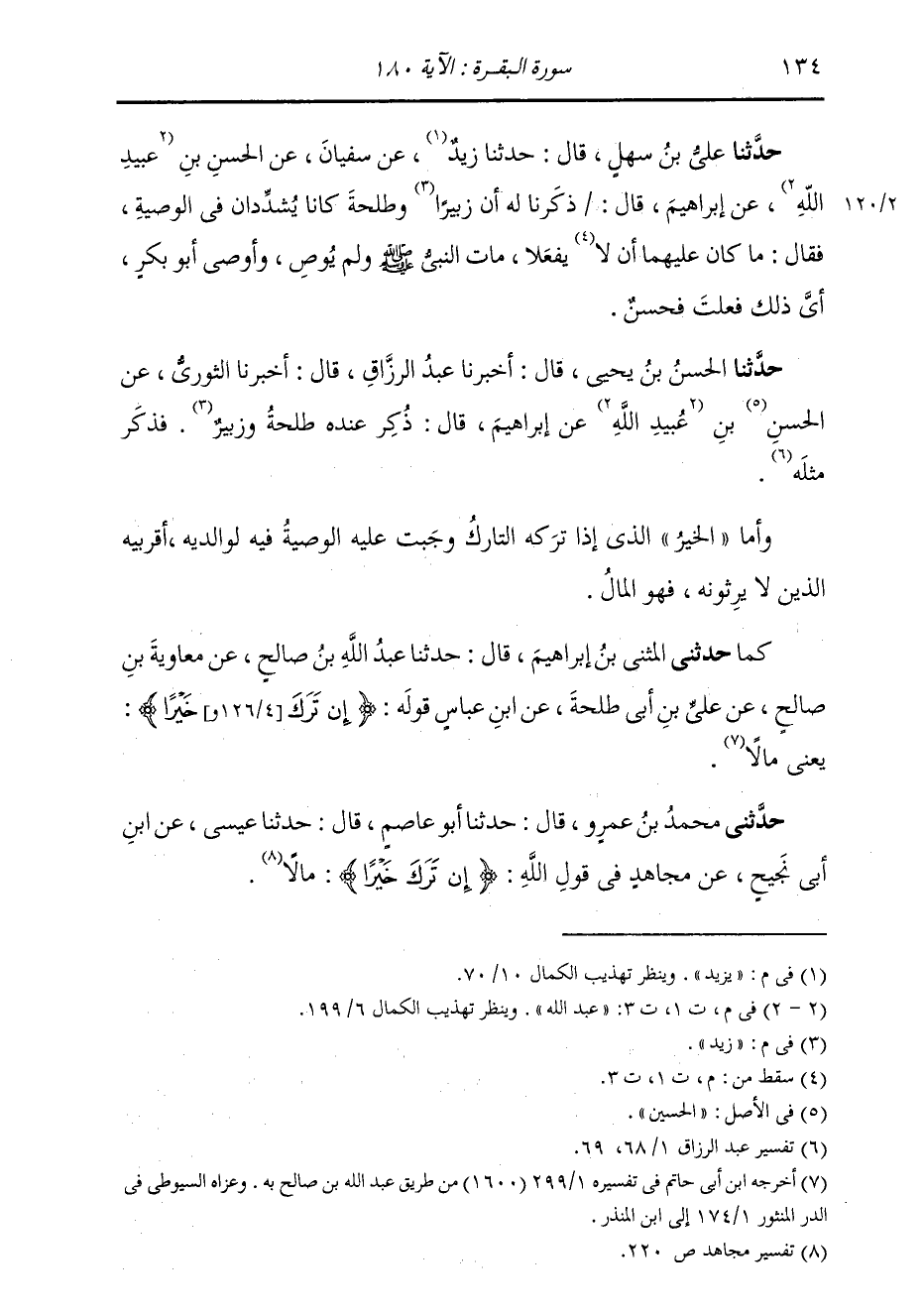 حَدَّثَنَا عَلِيُّ بْنُ سَهْلٍ، قَالَ: ثنا يَزِيدُ، عَنْ سُفْيَانَ، عَنِ الْحَسَنِ بْنِ عَبْدِ اللَّهِ، عَنْ إِبْرَاهِيمَ، قَالَ «ذَكَرْنَا لَهُ أَنَّ زَيْدًا، وَطَلْحَةَ كَانَا يُشَدِّدَانِ فِي الْوَصِيَّةِ، فَقَالَ» §مَا كَانَ عَلَيْهِمَا أَنْ يَفْعَلَا، مَاتَ النَّبِيُّ صَلَّى اللهُ عَلَيْهِ وَسَلَّمَ وَلَمْ يُوصِ، وَأَوْصَى أَبُو بَكْرٍ، أَيُّ ذَلِكَ فَعَلْتَ فَحَسَنٌ " حَدَّثَنَا الْحَسَنُ بْنُ يَحْيَى، قَالَ: أَخْبَرَنَا عَبْدُ الرَّزَّاقِ، قَالَ: أَخْبَرَنَا الثَّوْرِيُّ، عَنِ الْحَسَنِ بْنِ عَبْدِ اللَّهِ، عَنْ إِبْرَاهِيمَ، قَالَ: ذُكِرَ عِنْدَهُ طَلْحَةُ، وَزَيْدٌ، فَذَكَرَ مِثْلَهُ وَأَمَّا الْخَيْرُ الَّذِي إِذَا تَرَكَهُ تَارِكٌ وَجَبَ عَلَيْهِ الْوَصِيَّةُ فِيهِ لِوَالِدَيْهِ وَأَقْرَبِيهِ الَّذِينَ لَا يَرِثُونَ فَهُوَ الْمَالُ