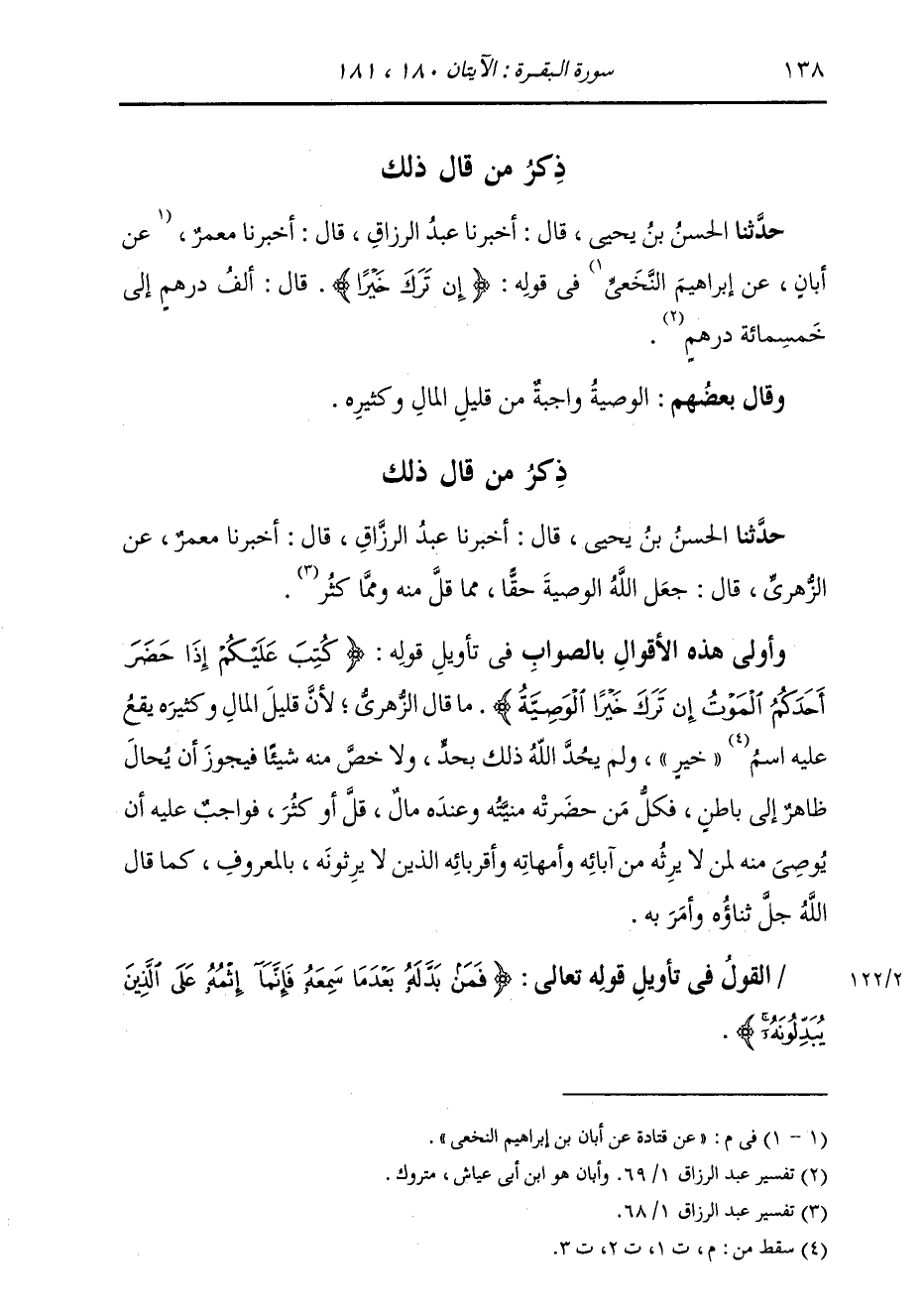 ذِكْرُ مَنْ قَالَ ذَلِكَ حَدَّثَنَا الْحَسَنُ بْنُ يَحْيَى، قَالَ: أَخْبَرَنَا عَبْدُ الرَّزَّاقِ، قَالَ: أَخْبَرَنَا مَعْمَرٌ، عَنْ قَتَادَةَ، عَنْ أَبَانَ عَنْ إِبْرَاهِيمَ النَّخَعِيِّ، فِي قَوْلِهِ " {§إِنْ تَرَكَ خَيْرًا} [البقرة: 180] قَالَ: أَلْفُ دِرْهَمٍ إِلَى خَمْسِمِائَةٍ " وَقَالَ بَعْضُهُمُ: الْوَصِيَّةُ وَاجِبَةٌ مِنْ قَلِيلِ الْمَالِ وَكَثِيرِهِ