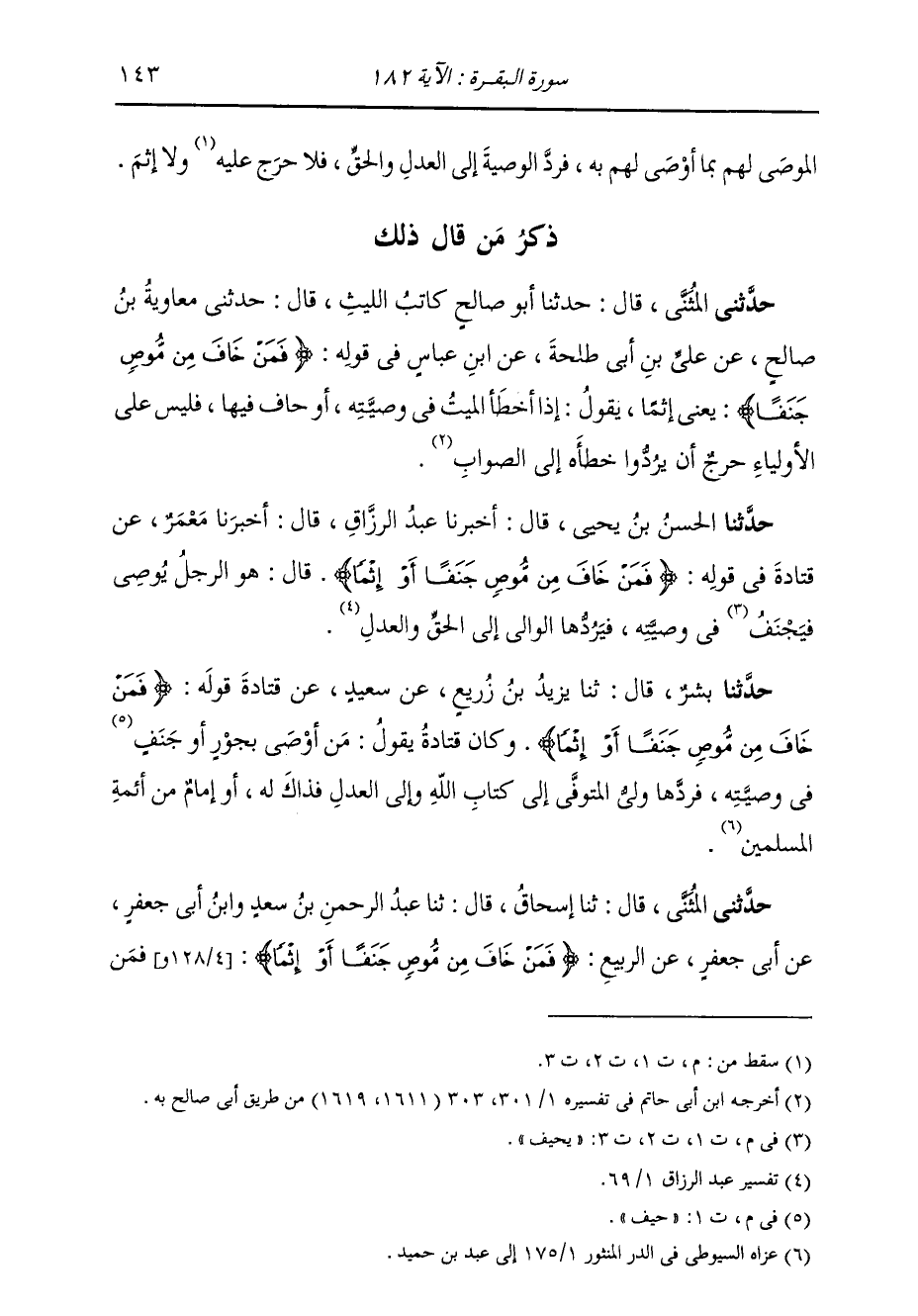 حَدَّثَنَا بِشْرُ بْنُ مُعَاذٍ، ثنا يَزِيدُ بْنُ زُرَيْعٍ، عَنْ سَعِيدٍ، عَنْ قَتَادَةَ قَوْلِهِ: {§فَمَنْ خَافَ مِنْ مُوصِ جَنَفًا أَوْ إِثْمًا} [البقرة: 182] وَكَانَ قَتَادَةُ، يَقُولُ «مَنْ أَوْصَى بِجَوْرٍ، أَوْ حَيْفٍ فِي وَصِيَّتِهِ فَرَدَّهَا وَلِيُّ الْمُتَوَفَّى أَوْ إِمَامٌ مِنْ أَئِمَّةِ الْمُسْلِمِينَ إِلَى كِتَابِ اللَّهِ وَإِلَى الْعَدْلِ، فَذَاكَ لَهُ»