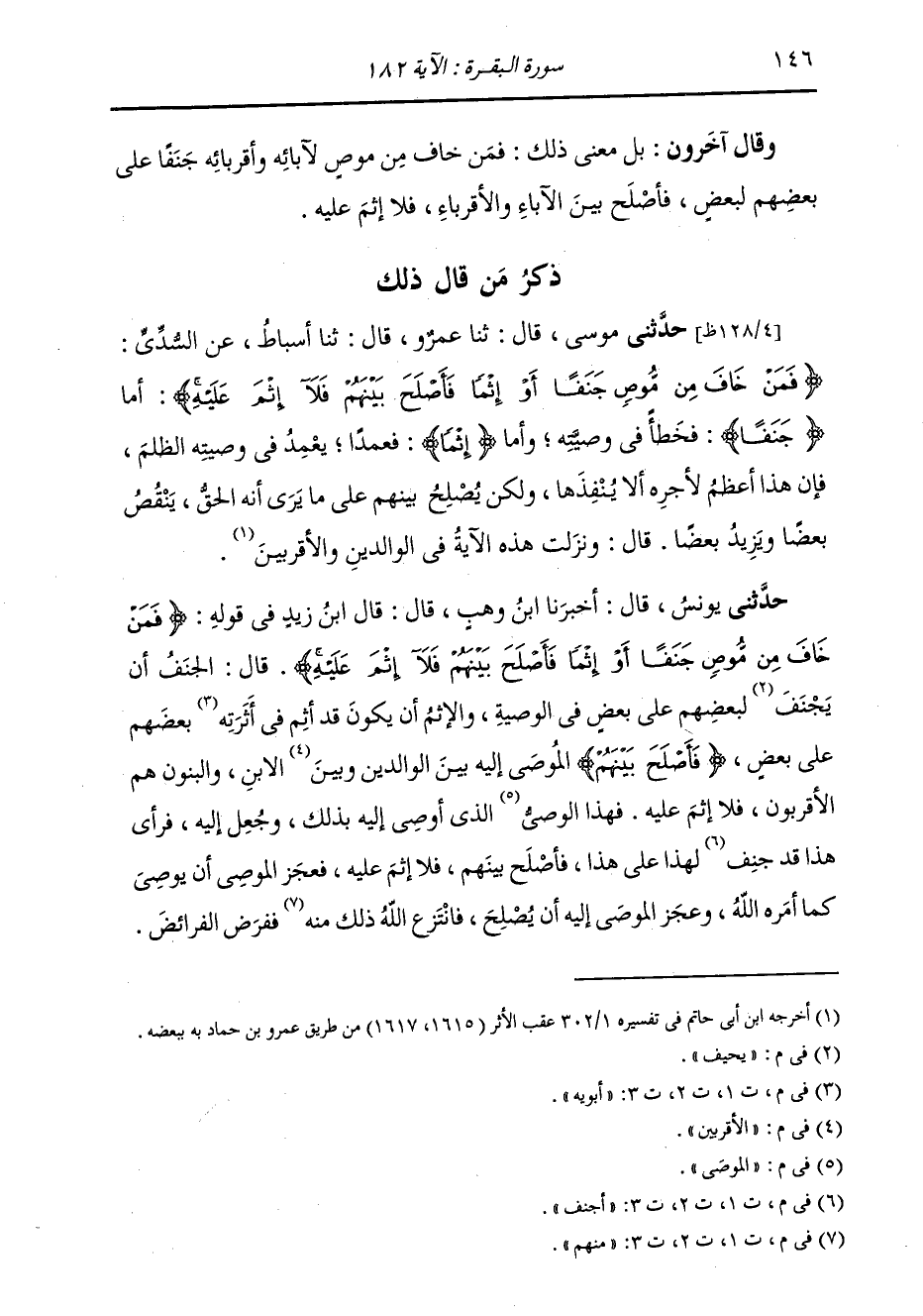 حَدَّثَنِي يُونُسُ، قَالَ: أَخْبَرَنَا ابْنُ وَهْبٍ، قَالَ: قَالَ ابْنُ زَيْدٍ، فِي قَوْلِهِ: {§فَمَنْ خَافَ مِنْ مُوصِ جَنَفًا أَوْ إِثْمًا فَأَصْلَحَ بَيْنَهُمْ فَلَا إِثْمَ عَلَيْهِ} [البقرة: 182] قَالَ " الْجَنَفُ: أَنْ يَحِيفَ لِبَعْضِهِمْ عَلَى بَعْضٍ فِي الْوَصِيَّةِ، وَالْإِثْمُ أَنْ يَكُونَ قَدْ أَثِمَ فِي أَبَوَيْهِ بَعْضُهُمْ عَلَى بَعْضٍ، فَأَصْلَحَ بَيْنَهُمُ الْمُوصَى إِلَيْهِ بَيْنَ الْوَالِدَيْنِ وَالْأَقْرَبِينَ الِابْنُ، وَالْبَنُونَ هُمُ الْأَقْرَبُونَ فَلَا إِثْمَ عَلَيْهِ، فَهَذَا الْمُوصَى الَّذِي أُوصِيَ إِلَيْهِ بِذَلِكَ وَجُعِلَ إِلَيْهِ فَرَأَى هَذَا قَدِ أَجْنَفَ لِهَذَا عَلَى هَذَا فَأَصْلَحَ بَيْنَهُمْ فَلَا إِثْمَ عَلَيْهِ، فَعَجَزَ الْمُوصَى أَنْ يُوصِيَ كَمَا أَمَرَهُ اللَّهُ تَعَالَى وَعَجَزَ الْمُوصَى إِلَيْهِ أَنْ يُصْلِحَ فَانْتَزَعَ اللَّهُ تَعَالَى ذِكْرُهُ ذَلِكَ مِنْهُمْ فَفَرَضَ الْفَرَائِضَ "