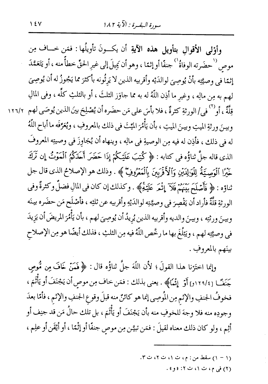 وَأَوْلَى الْأَقْوَالِ فِي تَأْوِيلِ الْآيَةِ، أَنْ يَكُونَ تَأْوِيلُهَا: فَمَنْ خَافَ مِنْ مُوصِ جَنَفًا، أَوْ إِثْمًا وَهُوَ أَنْ يَمِيلَ إِلَى غَيْرِ الْحَقِّ خَطَأً مِنْهُ أَوْ يَتَعَمَّدُ إِثْمًا فِي وَصِيَّتِهِ بِأَنْ يُوصِيَ لِوَالِدَيْهِ وَأَقْرَبِيهِ الَّذِينَ لَا يَرِثُونَهُ بِأَكْثَرَ مِمَّا يَجُوزُ لَهُ أَنْ يُوصِيَ لَهُمْ بِهِ مِنْ مَالِهِ، وَغَيْرِ مَا أَذِنَ اللَّهُ لَهُ بِهِ مِمَّا جَاوَزَ الثُّلُثَ، أَوْ بِالثُّلُثِ كُلِّهِ وَفِي الْمَالِ قِلَّةٌ، وَفِي الْوَرَثَةِ كَثْرَةٌ، فَلَا بَأْسَ عَلَى مَنْ حَضَرَهُ أَيْ يُصْلِحَ بَيْنَ الَّذِينَ يُوصَى لَهُمْ وَبَيْنَ وَرَثَةِ الْمَيِّتِ وَبَيْنَ الْمَيِّتِ، بِأَنْ يَأْمُرَ الْمَيِّتَ فِي ذَلِكَ بِالْمَعْرُوفِ، وَيُعَرِّفَهُ مَا أَبَاحَ اللَّهُ لَهُ فِي ذَلِكَ، وَأْذِنَ لَهُ فِيهِ مِنَ الْوَصِيَّةِ فِي مَالِهِ، وَيَنْهَاهُ أَنْ يُجَاوِزَ فِي وَصِيَّتِهِ الْمَعْرُوفَ الَّذِي قَالَ اللَّهُ تَعَالَى ذِكْرُهُ فِي كِتَابِهِ: {كُتِبَ عَلَيْكُمْ إِذَا حَضَرَ أَحَدَكُمُ الْمَوْتُ إِنْ تَرَكَ خَيْرًا الْوَصِيَّةُ لِلْوَالِدَيْنِ وَالْأَقْرَبِينَ بِالْمَعْرُوفِ} [البقرة: 180] وَذَلِكَ هُوَ الْإِصْلَاحُ الَّذِي قَالَ اللَّهُ تَعَالَى ذِكْرُهُ: {فَأَصْلَحَ بَيْنَهُمْ فَلَا إِثْمَ عَلَيْهِ} [البقرة: 182] وَكَذَلِكَ لِمَنْ كَانَ فِي الْمَالِ فَضْلٌ وَكَثْرَةٌ، وَفِي الْوَرَثَةِ قِلَّةٌ، فَأَرَادَ أَنْ يَقْصُرَ فِي وَصِيَّتِهِ لِوَالِدَيْهِ وَأَقْرَبِيهِ عَنْ ثُلُثِهِ، فَأَصْلَحَ مَنْ حَضَرَهُ بَيْنَهُ وَبَيْنَ وَرَثَتِهِ وَبَيْنَ وَالِدَيْهِ وَأَقْرَبِيهِ الَّذِينَ يُرِيدُ أَنْ يُوصِيَ لَهُمْ بِأَنْ يَأْمُرَ الْمَرِيضَ أَنْ يَزِيدَ فِي وَصِيَّتِهِ لَهُمْ، وَيَبْلُغَ بِهَا مَا رَخَّصَ اللَّهُ فِيهِ مِنَ الثُّلُثِ، فَذَلِكَ أَيْضًا هُوَ مِنَ الْإِصْلَاحِ بَيْنَهُمْ بِالْمَعْرُوفِ. وَإِنَّمَا اخْتَرْنَا هَذَا الْقَوْلَ لِأَنَّ اللَّهَ تَعَالَى ذِكْرُهُ قَالَ: {فَمَنْ خَافَ مِنْ مُوصِ جَنَفًا أَوْ إِثْمًا} [البقرة: 182] يَعْنِي بِذَلِكَ: فَمَنْ خَافَ مِنْ مُوصِ أَنْ يَجْنِفَ أَوْ يَأْثَمَ. فَخَوْفُ الْجَنَفِ، وَالْإِثْمِ مِنَ الْمُوصِي إِنَّمَا هُوَ كَائِنٌ قَبْلَ وقُوعِ الْجَنَفِ، وَالْإِثْمِ، فَأَمَّا بَعْدَ وُجُودِهِ مِنْهُ فَلَا وَجْهَ لِلْخَوْفِ مِنْهُ بِأَنْ يَجْنِفَ، أَوْ يَأْثَمَ، بَلْ تِلْكَ حَالُ مَنْ قَدْ جَنِفَ أَوْ أَثِمَ، وَلَوْ كَانَ ذَلِكَ مَعْنَاهُ قِيلَ: فَمَنْ تَبَيَّنَ مِنْ مُوصِ جَنَفًا، أَوْ إِثْمًا، أَوْ أَيْقَنَ أَوْ عَلِمَ
