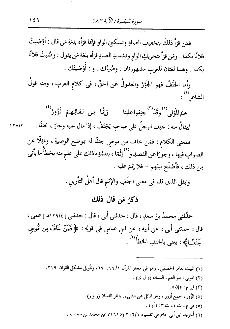 فَمَنْ قَرَأَ ذَلِكَ بِتَخْفِيفِ الصَّادِ وَتَسْكِينِ الْوَاوِ، فَإِنَّمَا قَرَأَهُ بِلُغَةِ مَنْ قَالَ: أَوْصَيْتُ فُلَانًا بِكَذَا. وَمَنْ قَرَأَ بِتَحْرِيكِ الْوَاوِ وَتَشْدِيدِ الصَّادِ قَرَأَهُ بِلُغَةِ مَنْ يَقُولُ: وَصَيْتُ فُلَانًا بِكَذَا، وَهُمَا لُغَتَانِ لِلْعَرَبِ مَشْهُورَتَانِ وَصِيَّتُكَ وَأَوْصَيْتُكَ. وَأَمَّا الْجَنَفُ فَهُوَ الْجَوْرُ، وَالْعُدُولُ عَنِ الْحَقِّ فِي كَلَامِ الْعَرَبِ، وَمِنْهُ قَوْلُ الشَّاعِرِ: