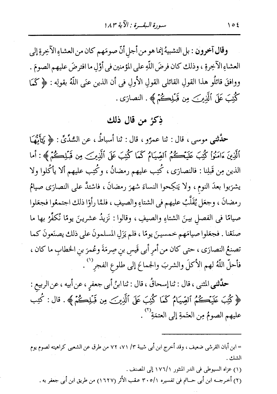 ذِكْرُ مَنْ قَالَ ذَلِكَ حَدَّثَنِي مُوسَى بْنُ هَارُونَ، قَالَ: ثنا عَمْرُو بْنُ حَمَّادٍ، قَالَ: ثنا أَسْبَاطٌ، عَنِ السُّدِّيِّ: {§يَا أَيُّهَا الَّذِينَ آمَنُوا كُتِبَ عَلَيْكُمُ الصِّيَامُ كَمَا كُتِبَ عَلَى الَّذِينَ مِنْ قَبْلِكُمْ} [البقرة: 183] " أَمَا الَّذِينَ مِنْ قَبْلِنَا فَالنَّصَارَى، كُتِبَ عَلَيْهِمْ رَمَضَانُ، وَكُتِبَ عَلَيْهِمْ أَنْ لَا يَأْكُلُوا وَلَا يَشْرَبُوا بَعْدَ النَّوْمِ، وَلَا يَنْكِحُوا النِّسَاءَ شَهْرَ رَمَضَانَ. فَاشْتَدَّ عَلَى النَّصَارَى صِيَامُ رَمَضَانَ، وَجَعَلَ يُقَلِّبُ عَلَيْهِمْ فِي الشِّتَاءِ، وَالصَّيْفِ؛ فَلَمَّا رَأَوْا ذَلِكَ اجْتَمَعُوا فَجَعَلُوا صِيَامًا فِي الْفَصْلِ بَيْنَ الشِّتَاءِ، وَالصَّيْفِ، وَقَالُوا: نَزِيدُ عِشْرِينَ يَوْمًا نُكَفِّرُ بِهَا مَا صَنَعْنَا. فَجَعَلُوا صِيَامَهُمْ خَمْسِينَ، فَلَمْ يَزَلِ الْمُسْلِمُونَ عَلَى ذَلِكَ يَصْنَعُونَ كَمَا تَصْنَعُ النَّصَارَى، حَتَّى كَانَ مَنْ أَمْرِ أَبِي قَيْسِ بْنُ صِرْمَةَ، وَعُمَرَ بْنِ الْخَطَّابِ مَا كَانَ، فَأَحَلَّ اللَّهُ لَهُمُ الْأَكْلَ وَالشُّرْبَ وَالْجِمَاعَ إِلَى طُلُوعِ الْفَجْرِ "