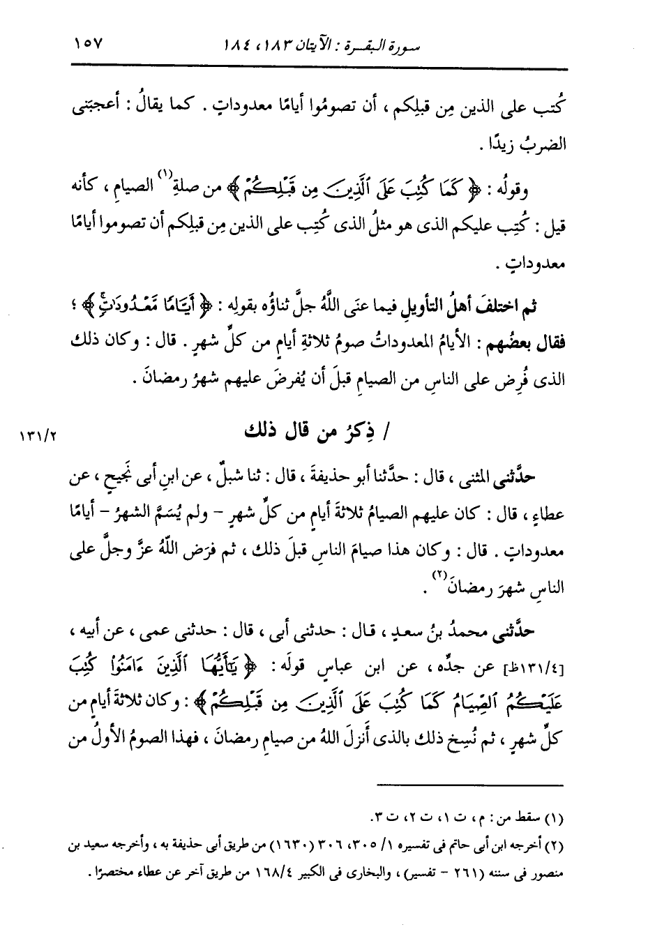 حَدَّثَنِي مُحَمَّدُ بْنُ سَعْدٍ، قَالَ: حَدَّثَنِي أَبِي، قَالَ: حَدَّثَنِي عَمِّي، قَالَ: حَدَّثَنِي أَبِي، عَنْ أَبِيهِ، عَنِ ابْنِ عَبَّاسٍ، قَوْلِهِ: {§يَا أَيُّهَا الَّذِينَ آمَنُوا كُتِبَ عَلَيْكُمُ الصِّيَامُ كَمَا كُتِبَ عَلَى الَّذِينَ مِنْ قَبْلِكُمْ لَعَلَّكُمْ تَتَّقُونَ} [البقرة: 183] «وَكَانَ ثَلَاثَةَ أَيَّامٍ مِنْ كُلِّ شَهْرٍ، ثُمَّ نُسِخَ ذَلِكَ بِالَّذِي أُنْزِلَ مِنْ صِيَامِ رَمَضَانَ، فَهَذَا الصَّوْمُ الْأَوَّلُ مِنَ -[158]- الْعَتَمَةِ»
