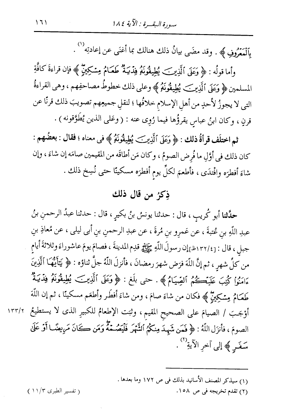 بِالْمَعْرُوفِ} [البقرة: 178] وَقَدْ مَضَى بَيَانُ ذَلِكَ هُنَالِكَ بِمَا أَغْنَى عَنْ إِعَادَتِهِ. وَأَمَّا قَوْلُهُ: {وَعَلَى الَّذِينَ يُطِيقُونَهُ فِدْيَةٌ طَعَامُ مِسْكِينٍ} [البقرة: 184] فَإِنَّ قِرَاءَةَ كَافَّةِ الْمُسْلِمِينَ: {وَعَلَى الَّذِينَ يُطِيقُونَهُ} [البقرة: 184] وَعَلَى ذَلِكَ خُطُوطُ مَصَاحِفِهِمْ، وَهِيَ الْقِرَاءَةُ الَّتِي لَا يَجُوزُ لِأَحَدٍ مِنْ أَهْلِ الْإِسْلَامِ خِلَافَهَا لِنَقْلِ جَمِيعِهِمْ تَصْوِيبَ ذَلِكَ قَرْنًا عَنْ قَرْنٍ. وَكَانَ ابْنُ عَبَّاسٍ يَقْرَؤُهَا فِيمَا رُوِيَ عَنْهُ: «وَعَلَى الَّذِينَ يُطَوِّقُونَهُ» . ثُمَّ اخْتَلَفَ قُرَّاءُ ذَلِكَ: {وَعَلَى الَّذِينَ يُطِيقُونَهُ} [البقرة: 184] فِي مَعْنَاهُ، فَقَالَ بَعْضُهُمْ: كَانَ ذَلِكَ فِي أَوَّلِ مَا فُرِضَ الصَّوْمُ، وَكَانَ مَنْ أَطَاقَهُ مِنَ الْمُقِيمِينَ صَامَهُ إِنْ شَاءَ، وَإِنْ شَاءَ أَفْطَرَهُ وَافْتَدَى فَأَطْعَمَ لِكُلِّ يَوْمٍ أَفْطَرَهُ مِسْكِينًا حَتَّى نُسِخَ ذَلِكَ