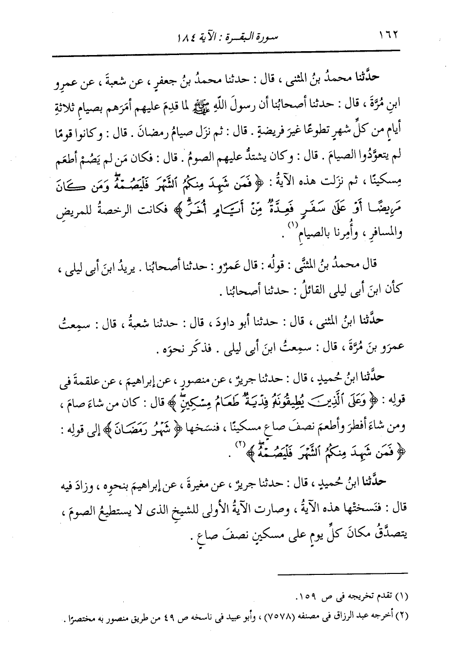 حَدَّثَنَا ابْنُ حُمَيْدٍ، قَالَ: ثنا جَرِيرٌ، عَنْ مُغِيرَةَ، عَنْ إِبْرَاهِيمَ، بِنَحْوِهِ، وَزَادَ فِيهِ قَالَ «§فَنَسَخَتْهَا هَذِهِ الْآيَةُ، وَصَارَتِ الْآيَةُ الْأُولَى لِلشَّيْخِ الَّذِي لَا يَسْتَطِيعُ الصَّوْمَ يَتَصَدَّقُ مَكَانَ كُلِّ يَوْمٍ عَلَى مِسْكِينٍ نِصْفَ صَاعٍ»