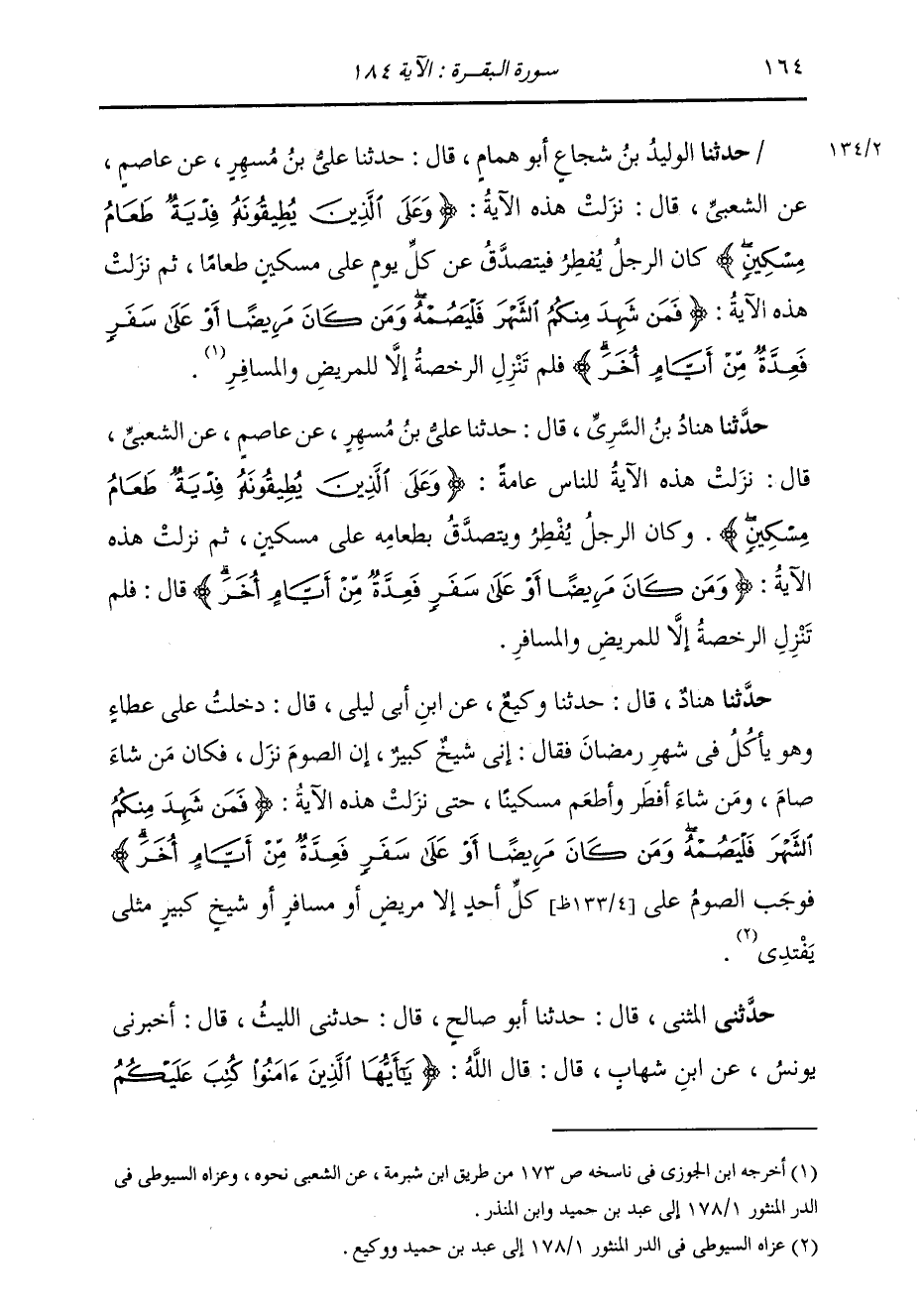 حَدَّثَنِي الْمُثَنَّى، قَالَ: ثنا أَبُو صَالِحٍ، قَالَ: حَدَّثَنِي اللَّيْثُ، قَالَ: أَخْبَرَنِي يُونُسُ، عَنِ ابْنِ شِهَابٍ، قَالَ: قَالَ اللَّهُ: {§يَا أَيُّهَا الَّذِينَ آمَنُوا كُتِبَ عَلَيْكُمُ -[165]- الصِّيَامُ كَمَا كُتِبَ عَلَى الَّذِينَ مِنْ قَبْلِكُمْ} [البقرة: 183] قَالَ ابْنُ شِهَابٍ، " كَتَبَ اللَّهُ الصِّيَامَ عَلَيْنَا، فَكَانَ مِنْ شَاءَ افْتَدَى مِمَّنْ يُطِيقُ الصِّيَامَ مِنْ صَحِيحٍ أَوْ مَرِيضٍ أَوْ مُسَافِرٍ، وَلَمْ يَكُنْ عَلَيْهِ غَيْرُ ذَلِكَ. فَلَمَّا أَوْجَبَ اللَّهُ عَلَى مَنْ شَهِدَ الشَّهْرَ الصِّيَامَ، فَمَنْ كَانَ صَحِيحًا يُطِيقُهُ وُضِعَ عَنْهُ الْفِدْيَةُ، وَكَانَ مَنْ كَانَ عَلَى سَفَرٍ أَوْ كَانَ مَرِيضًا فَعِدَّةٌ مِنْ أَيَّامٍ أُخَرَ. قَالَ: وَبَقِيَتِ الْفِدْيَةُ الَّتِي كَانَتْ تُقْبَلُ قَبْلَ ذَلِكَ لِلْكَبِيرِ الَّذِي لَا يُطِيقُ الصِّيَامَ، وَالَّذِي يَعْرِضُ لَهُ الْعَطَشُ أَوِ الْعِلَّةُ الَّتِي لَا يَسْتَطِيعُ مَعَهَا الصِّيَامَ "