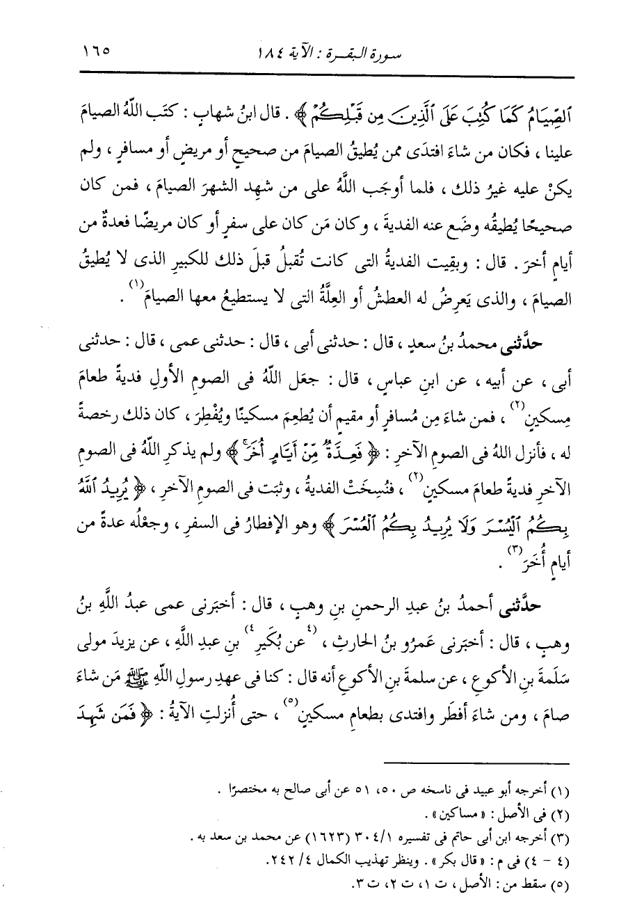 حَدَّثَنِي مُحَمَّدُ بْنُ سَعْدٍ، قَالَ: حَدَّثَنِي أَبِي قَالَ: حَدَّثَنِي عَمِّي، قَالَ: حَدَّثَنِي أَبِي، عَنْ أَبِيهِ، عَنِ ابْنِ عَبَّاسٍ، قَالَ " جَعَلَ اللَّهُ فِي الصَّوْمِ الْأَوَّلِ فِدْيَةً طَعَامَ مِسْكِينٍ، فَمَنْ شَاءَ مِنْ مُسَافِرٍ، أَوْ مُقِيمٍ أَنْ يُطْعِمَ مِسْكِينًا، وَيُفْطِرَ كَانَ ذَلِكَ رُخْصَةً لَهُ، فَأَنْزَلَ اللَّهُ فِي الصَّوْمِ الْآخَرِ: {§فَعِدَّةٌ مِنْ أَيَّامٍ أُخَرَ} [البقرة: 184] وَلَمْ يَذْكُرِ اللَّهُ فِي الصَّوْمِ الْآخَرِ فِدْيَةً طَعَامَ مِسْكِينٍ، فَنُسِخَتِ الْفِدْيَةً، وَثَبَتَ فِي الصَّوْمِ الْآخَرِ: {يُرِيدُ اللَّهُ بِكُمُ الْيُسْرَ وَلَا يُرِيدُ بِكُمُ الْعُسْرَ} [البقرة: 185] وَهُوَ الْإِفْطَارُ فِي السَّفَرِ، وَجَعَلَهُ عِدَّةً مِنْ أَيَّامٍ أُخَرَ "
