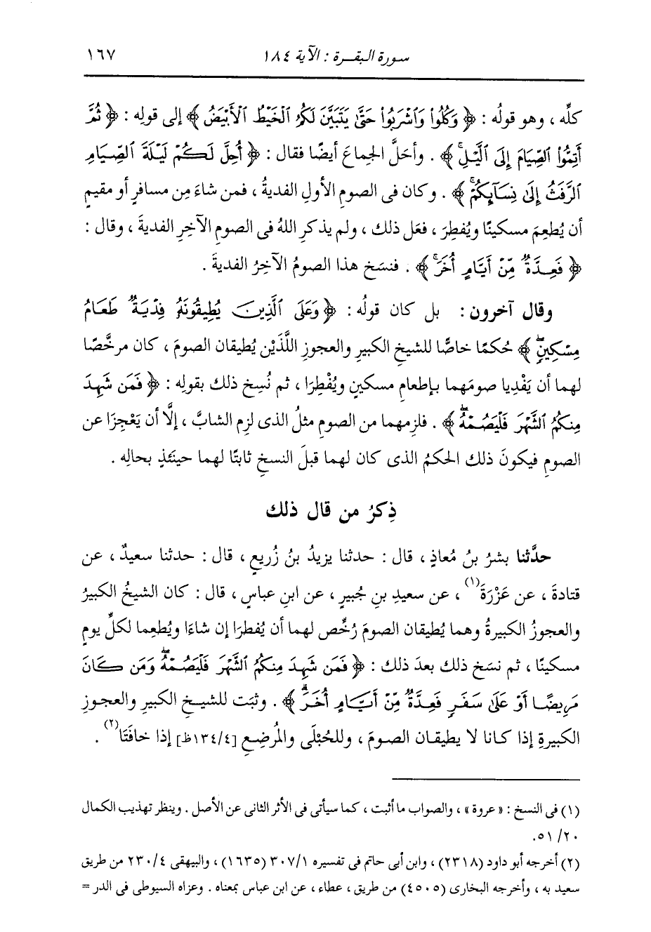 ذِكْرُ مَنْ قَالَ ذَلِكَ حَدَّثَنَا بِشْرُ بْنُ مُعَاذٍ، قَالَ: ثنا يَزِيدُ بْنُ زُرَيْعٍ، قَالَ: ثنا سَعِيدٌ، عَنْ قَتَادَةَ، عَنْ عُرْوَةَ، عَنْ سَعِيدِ بْنِ جُبَيْرٍ، عَنِ ابْنِ عَبَّاسٍ، قَالَ " §كَانَ الشَّيْخُ الْكَبِيرُ، وَالْعَجُوزُ الْكَبِيرَةُ، وَهُمَا يُطِيقَانِ الصَّوْمَ رُخِّصَ لَهُمَا أَنْ يُفْطِرَا إِنْ شَاءَا، وَيُطْعِمَا لِكُلِّ يَوْمٍ مِسْكِينًا، ثُمَّ نُسِخَ ذَلِكَ بَعْدَ ذَلِكَ: {فَمَنْ شَهِدَ مِنْكُمُ الشَّهْرَ فَلْيَصُمْهُ وَمَنْ كَانَ مَرِيضًا أَوْ عَلَى سَفَرٍ فَعِدَّةٌ مِنْ أَيَّامٍ أُخَرَ} [البقرة: 185] وَثَبَتَ لِلشَّيْخِ الْكَبِيرِ، وَالْعَجُوزِ الْكَبِيرَةِ إِذَا كَانَا لَا يُطِيقَانِ الصَّوْمَ، وَلِلْحُبْلَى وَالْمُرْضِعِ إِذَا خَافَتَا " -[168]- حَدَّثَنِي الْمُثَنَّى، قَالَ: ثنا سُوَيْدٌ، قَالَ: أَخْبَرَنَا ابْنُ الْمُبَارَكِ، عَنْ سَعِيدٍ، عَنْ قَتَادَةَ، عَنْ عُرْوَةَ، عَنْ سَعِيدِ بْنِ جُبَيْرٍ، عَنِ ابْنِ عَبَّاسٍ: {وَعَلَى الَّذِينَ يُطِيقُونَهُ} [البقرة: 184] قَالَ: الشَّيْخُ الْكَبِيرُ وَالْعَجُوزُ الْكَبِيرَةُ ثُمَّ ذَكَرَ مِثْلَ حَدِيثِ بِشْرٍ عَنْ يَزِيدَ