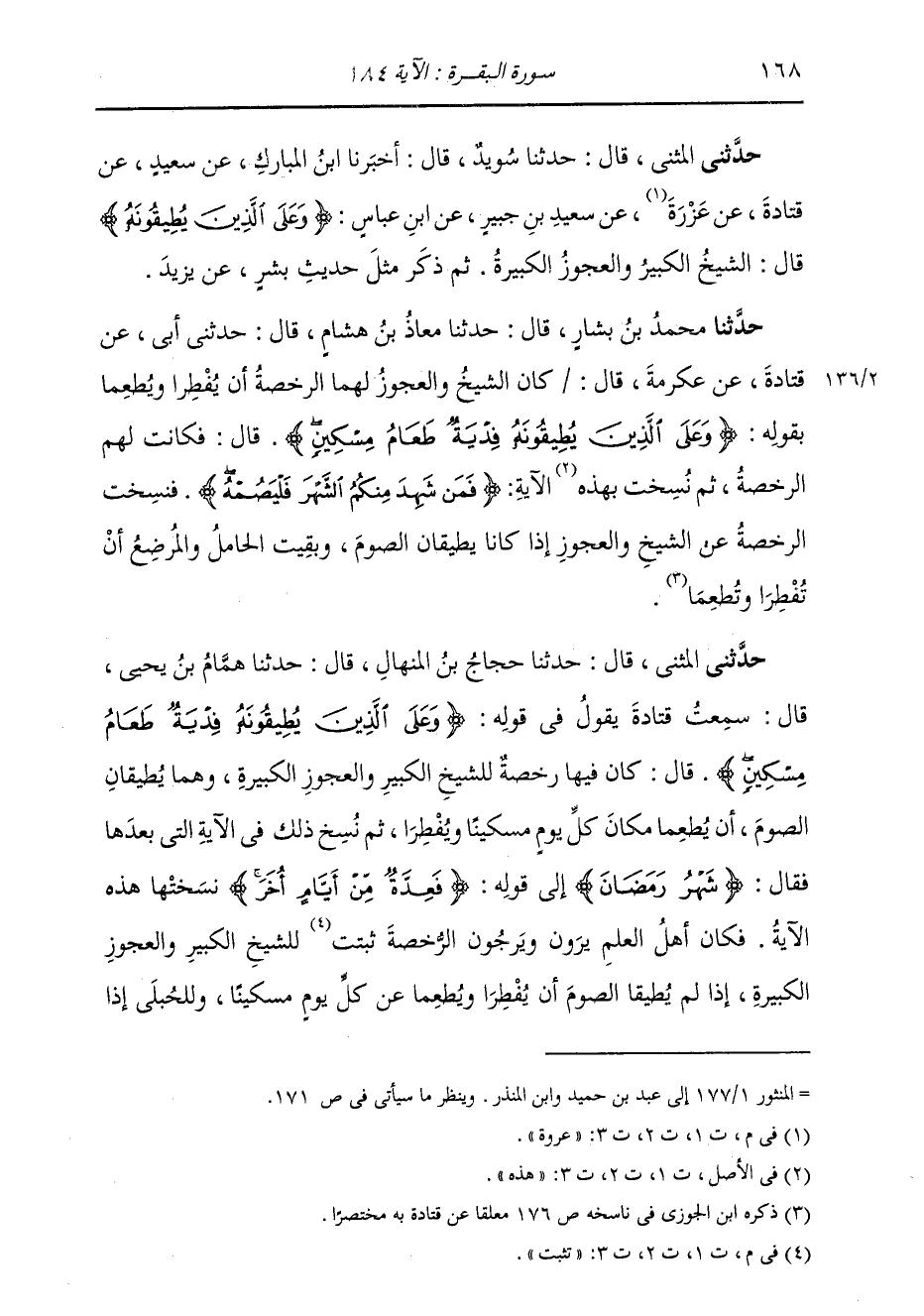 حَدَّثَنِي الْمُثَنَّى، قَالَ: ثنا حَجَّاجُ بْنُ الْمِنْهَالِ، قَالَ، ثنا هَمَّامُ بْنُ يَحْيَى، قَالَ: سَمِعْتُ قَتَادَةَ، يَقُولُ فِي قَوْلِهِ: {§وَعَلَى الَّذِينَ يُطِيقُونَهُ فِدْيَةٌ طَعَامُ مِسْكِينٍ} [البقرة: 184] قَالَ " كَانَ فِيهَا رُخْصَةٌ لِلشَّيْخِ الْكَبِيرِ، وَالْعَجُوزِ الْكَبِيرَةِ وَهُمَا يُطِيقَانِ الصَّوْمَ أَنْ يُطْعِمَا مَكَانَ كُلِّ يَوْمٍ مِسْكِينًا، وَيُفْطِرَا، ثُمَّ نُسِخَ ذَلِكَ بِالْآيَةِ الَّتِي بَعْدَهَا فَقَالَ: {شَهْرُ رَمَضَانَ} [البقرة: 185] إِلَى قَوْلِهِ: {فَعِدَّةٌ مِنْ أَيَّامٍ أُخَرَ} [البقرة: 184] فَنَسَخَتْهَا هَذِهِ الْآيَةُ " فَكَانَ أَهْلُ الْعِلْمِ يَرَوْنَ وَيَرْجُونَ الرُّخْصَةَ تَثْبُتُ لِلشَّيْخِ الْكَبِيرِ، وَالْعَجُوزِ الْكَبِيرَةِ إِذَا لَمْ يُطِيقَا الصَّوْمَ أَنْ يُفْطِرَا وَيُطْعِمَا عَنْ كُلِّ يَوْمٍ مِسْكِينًا، وَلِلْحُبْلَى إِذَا -[169]- خَشِيَتْ عَلَى مَا فِي بَطْنِهَا، وَلِلْمُرْضِعِ إِذَا مَا خَشِيَتْ عَلَى وَلَدِهَا