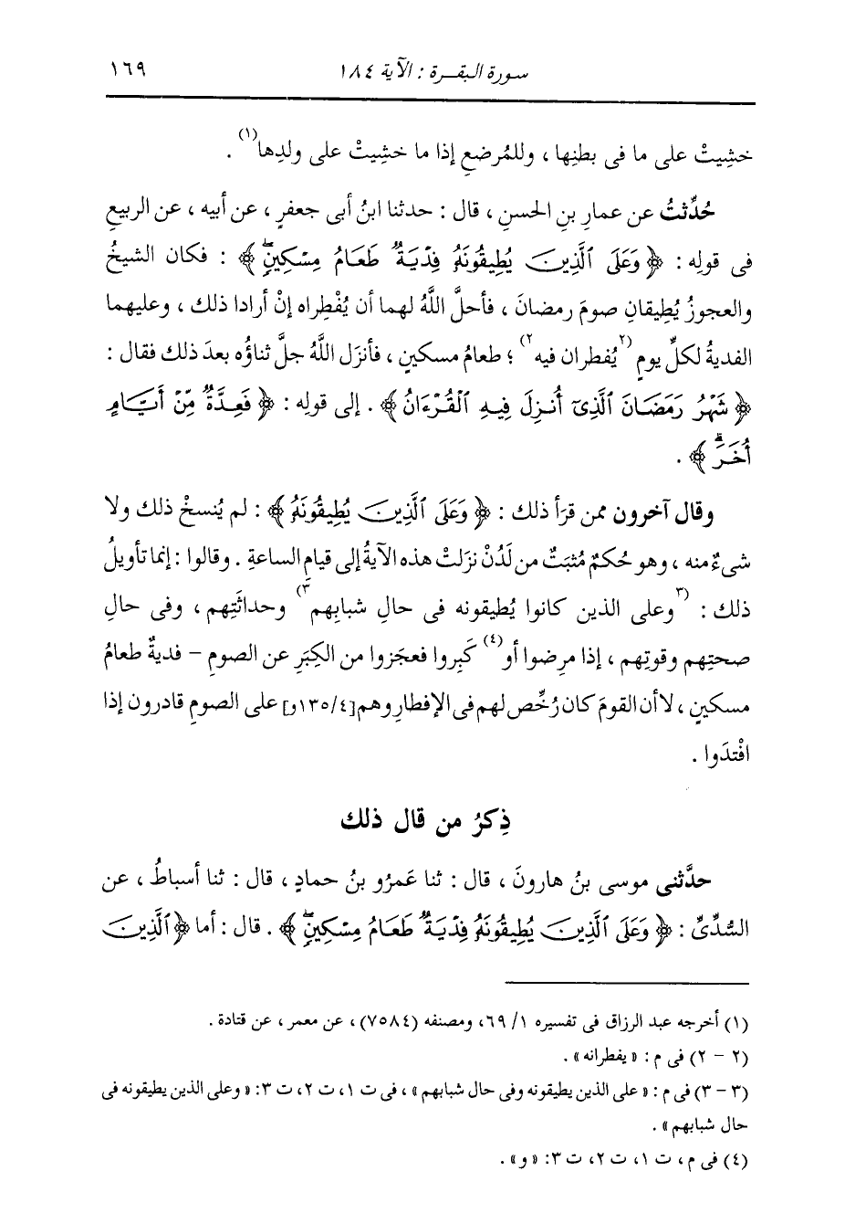 حُدِّثْتُ عَنْ عَمَّارِ بْنِ الْحَسَنِ، قَالَ: ثنا ابْنُ أَبِي جَعْفَرٍ، عَنْ أَبِيهِ، عَنِ الرَّبِيعِ، فِي قَوْلِهِ " {§وَعَلَى الَّذِينَ يُطِيقُونَهُ فِدْيَةٌ طَعَامُ مِسْكِينٍ} [البقرة: 184] فَكَانَ الشَّيْخُ وَالْعَجُوزُ يُطِيقَانِ صَوْمَ رَمَضَانَ، فَأَحَلَّ اللَّهُ لَهُمَا أَنْ يُفْطِرَاهَ إِنْ أَرَادَا ذَلِكَ، وَعَلَيْهِمَا الْفِدْيَةُ لِكُلِّ يَوْمٍ يُفْطِرَانِهِ طَعَامُ مِسْكِينٍ، فَأَنْزَلَ اللَّهُ بَعْدَ ذَلِكَ: {شَهْرُ رَمَضَانَ الَّذِي أُنْزِلَ فِيهِ الْقُرْآنُ} [البقرة: 185] إِلَى قَوْلِهِ: {فَعِدَّةٌ مِنْ أَيَّامٍ أُخَرَ} [البقرة: 184] " وَقَالَ آخَرُونَ مِمَّنْ قَرَأَ ذَلِكَ: {وَعَلَى الَّذِينَ يُطِيقُونَهُ} [البقرة: 184] لَمْ يُنْسَخُ ذَلِكَ وَلَا شَيْءٌ مِنْهُ، وَهُوَ حُكْمٌ مُثْبَتٌ مِنْ لَدُنْ نَزَلَتْ هَذِهِ الْآيَةُ إِلَى قِيَامِ السَّاعَةِ. وَقَالُوا: إِنَّمَا تَأْوِيلُ ذَلِكَ: عَلَى الَّذِينَ يُطِيقُونَهُ وَفِي حَالِ شَبَابِهِمْ، وَحَدَاثَتِهِمْ، وَفِي حَالِ صِحَّتِهِمْ وَقُوَّتِهِمْ إِذَا مَرِضُوا وَكَبِرُوا فَعَجَزُوا مِنَ الْكِبَرِ عَنِ الصَّوْمِ فِدْيَةٌ طَعَامُ مِسْكِينٍ؛ لَا أَنَّ الْقَوْمَ كَانَ رُخِّصَ لَهُمْ فِي الْإِفْطَارِ وَهُمْ عَلَى الصَّوْمِ قَادِرُونَ إِذَا افْتَدَوْا.