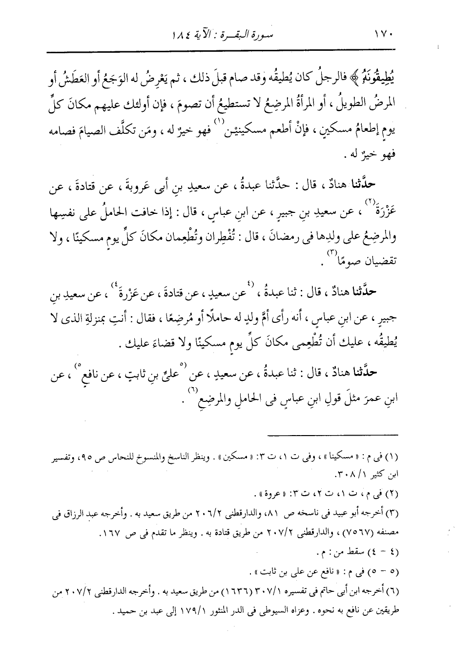 حَدَّثَنَا هَنَّادٌ، قَالَ: ثنا عَبْدَةُ، عَنْ سَعِيدِ بْنِ جُبَيْرٍ، عَنِ ابْنِ عَبَّاسٍ، أَنَّهُ رَأَى أُمَّ وَلَدٍ لَهُ حَامِلًا أَوْ مُرْضِعًا، فَقَالَ «§أَنْتَ بِمَنْزِلَةِ الَّذِي لَا يُطِيقُهُ، عَلَيْكَ أَنْ تُطْعِمِي مَكَانُ كُلِّ يَوْمٍ مِسْكِينًا وَلَا قَضَاءَ عَلَيْكَ» حَدَّثَنَا هَنَّادٌ، قَالَ: ثنا عَبْدَةُ، عَنْ سَعِيدٍ، عَنْ نَافِعٍ، عَنْ عَلِيِّ بْنِ ثَابِتٍ، عَنِ ابْنِ عُمَرَ، مِثْلَ قَوْلِ ابْنِ عَبَّاسٍ فِي الْحَامِلِ وَالْمُرْضِعِ