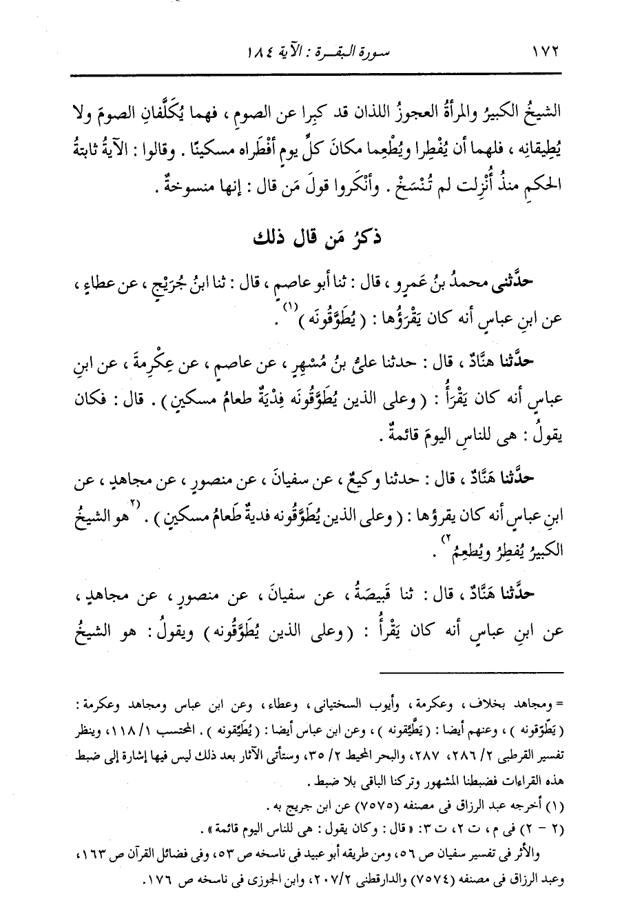 حَدَّثَنَا هَنَّادٌ، قَالَ: ثنا وَكِيعٌ، عَنْ سُفْيَانَ، عَنْ مَنْصُورٍ، عَنْ مُجَاهِدٍ، عَنِ ابْنِ عَبَّاسٍ " أَنَّهُ §كَانَ يَقْرَؤُهَا: «وَعَلَى الَّذِينَ يُطَوَّقُونَهُ فِدْيَةٌ طَعَامُ مِسْكِينٍ» قَالَ: وَكَانَ يَقُولُ هِيَ لِلنَّاسِ الْيَوْمَ قَائِمَةٌ "