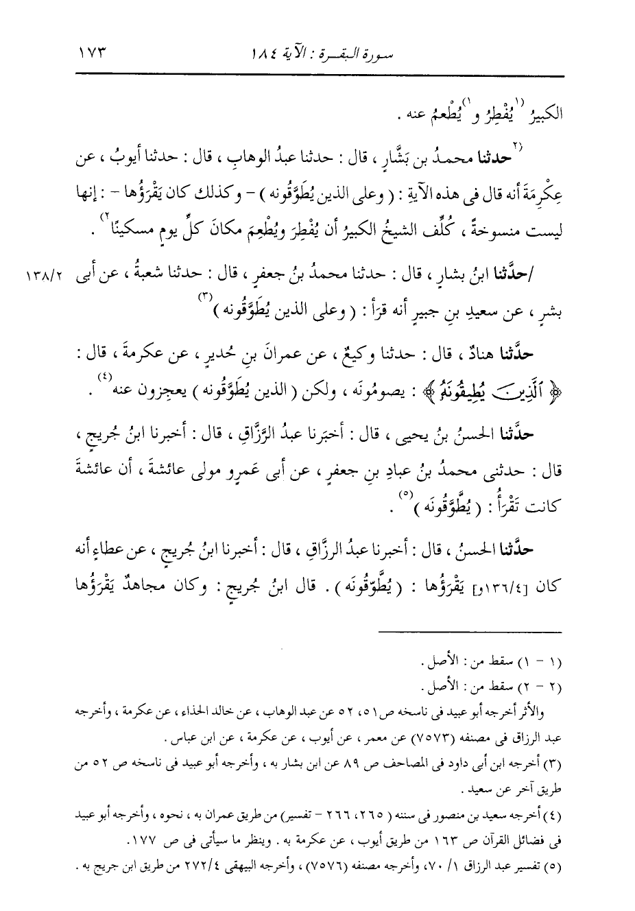 حَدَّثَنَا مُحَمَّدُ بْنُ بَشَّارٍ، قَالَ: ثنا عَبْدُ الْوَهَّابِ، قَالَ: ثنا أَيُّوبُ، عَنْ عِكْرِمَةَ، أَنَّهُ قَالَ فِي هَذِهِ الْآيَةِ: «§وَعَلَى الَّذِينَ يُطَوَّقُونَهُ» وَكَذَلِكَ كَانَ يَقْرَؤُهَا «أَنَّهَا لَيْسَتْ مَنْسُوخَةً كُلِّفَ الشَّيْخُ الْكَبِيرُ أَنْ يُفْطِرَ وَيُطْعِمَ مَكَانَ كُلِّ يَوْمٍ مِسْكِينًا»