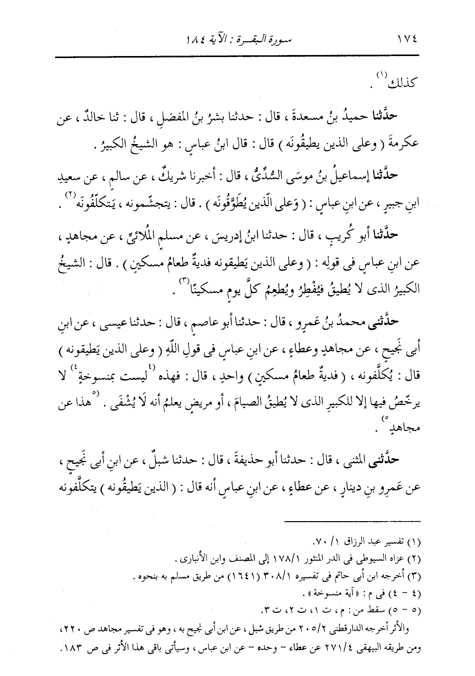 حَدَّثَنَا حُمَيْدُ بْنُ مَسْعَدَةَ، قَالَ: ثنا بِشْرُ بْنُ الْمُفَضَّلِ، قَالَ: ثنا خَالِدٌ، عَنْ عِكْرِمَةَ، {§وَعَلَى الَّذِينَ يُطِيقُونَهُ} [البقرة: 184] قَالَ: قَالَ ابْنُ عَبَّاسٍ، هُوَ الشَّيْخُ الْكَبِيرُ "