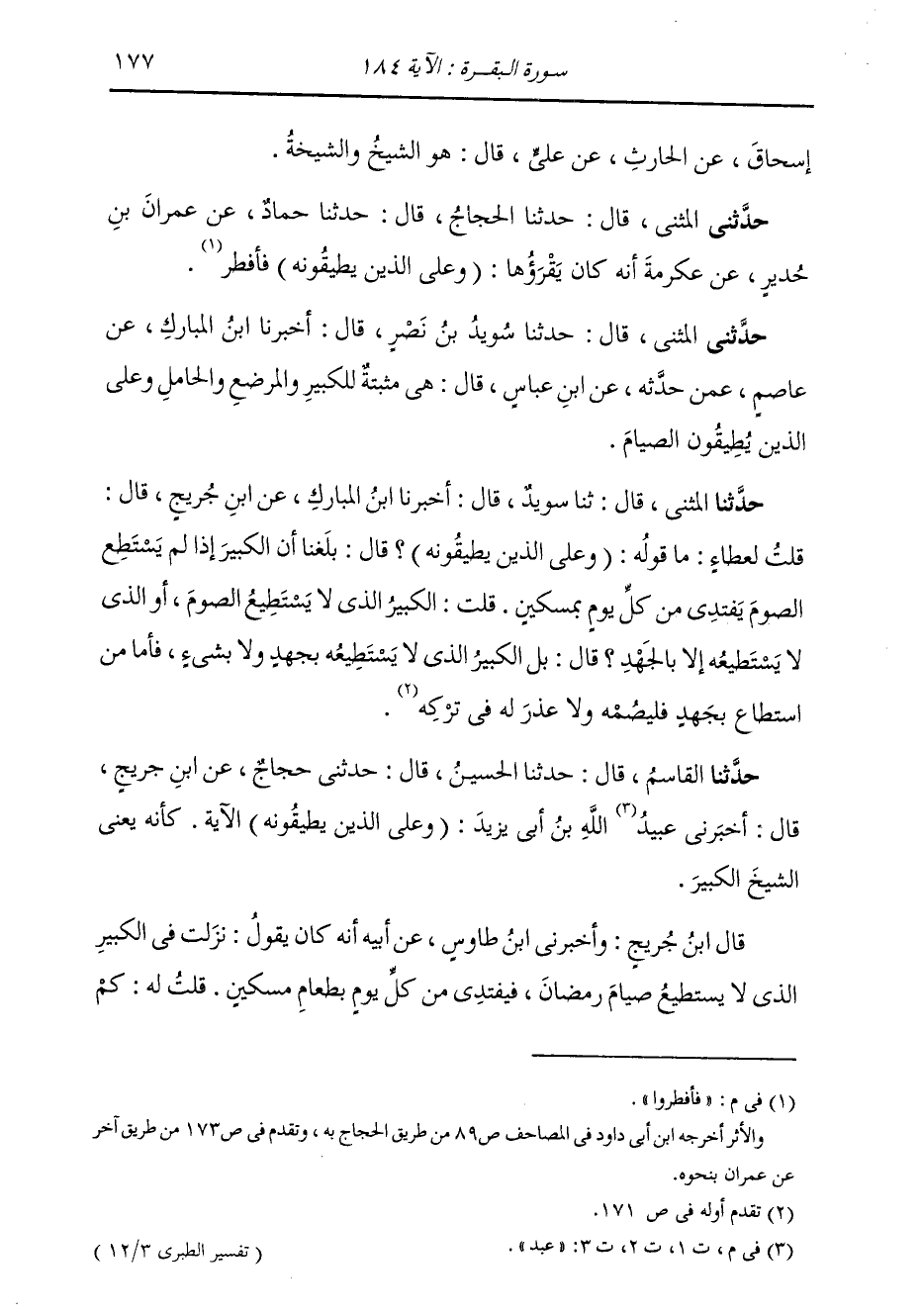 حَدَّثَنَا الْمُثَنَّى، قَالَ. ثنا سُوَيْدٌ، قَالَ، ثنا ابْنُ الْمُبَارَكِ، عَنِ ابْنِ جُرَيْجٍ، قَالَ: قُلْتُ لِعَطَاءٍ، مَا قَوْلُهُ: {§وَعَلَى الَّذِينَ يُطِيقُونَهُ} [البقرة: 184] قَالَ " بَلَغَنَا أَنَّ الْكَبِيرَ إِذَا لَمْ يَسْتَطِعِ الصَّوْمَ يَفْتَدِي مِنْ كُلِّ يَوْمٍ بِمِسْكِينٍ، قُلْتُ: الْكَبِيرُ الَّذِي لَا يَسْتَطِيعُ الصَّوْمَ، أَوِ الَّذِي لَا يَسْتَطِيعُهُ إِلَّا بِالْجَهْدِ؟ قَالَ: بَلِ الْكَبِيرُ الَّذِي لَا يَسْتَطِيعُهُ بِجَهْدٍ، وَلَا بِشَيْءٍ، فَأَمَّا مَنِ اسْتَطَاعَ بِجَهْدٍ فَلْيَصُمْهُ وَلَا عُذْرَ لَهُ فِي تَرْكِهِ "