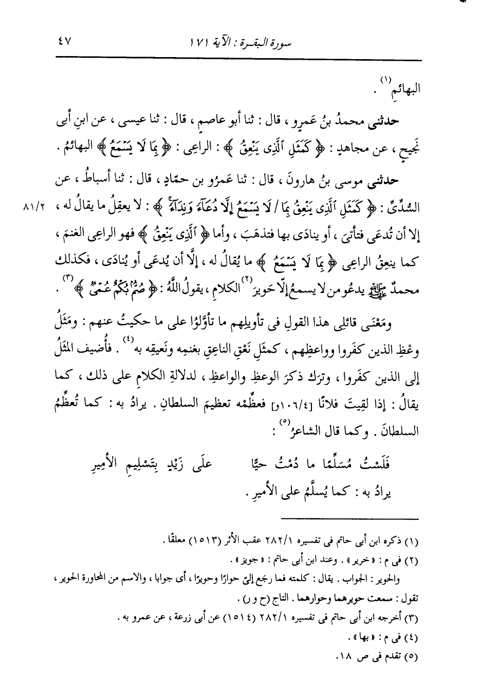 حَدَّثَنِي مُوسَى، قَالَ: ثنا عَمْرٌو، قَالَ: ثنا أَسْبَاطٌ، عَنِ السُّدِّيِّ: {§كَمَثَلِ الَّذِي يَنْعِقُ بِمَا لَا يَسْمَعُ إِلَّا دُعَاءً وَنِدَاءً} [البقرة: 171] لَا يَعْقِلُ مَا يُقَالُ لَهُ إِلَّا أَنْ تُدْعَى فَتَأْتِيَ أَوْ يُنَادَى بِهَا فَتَذْهَبَ، وَأَمَّا الَّذِي يَنْعِقُ فَهُوَ الرَّاعِي الْغَنَمَ كَمَا يَنْعِقُ الرَّعْيَ بِمَا لَا يَسْمَعُ مَا يُقَالُ لَهُ، إِلَّا أَنْ يُدْعَى أَوْ يُنَادَى، فَكَذَلِكَ مُحَمَّدٌ صَلَّى اللهُ عَلَيْهِ وَسَلَّمَ يَدْعُو مَنْ لَا يَسْمَعُ إِلَّا خَرِيرَ الْكَلَامِ يَقُولُ اللَّهُ: {صُمٌّ بِكُمٌ عُمْيٌ} [البقرة: 18] " وَمَعْنَى قَائِلِي هَذَا الْقَوْلِ فِي تَأْوِيلِهِمْ مَا تَأَوَّلُوا عَلَى مَا حَكَيْتُ عَنْهُمْ: وَمَثَلُ وَعْظِ الَّذِينَ كَفَرُوا وَوَاعِظِهِمْ كَمَثَلِ نَعْقِ النَّاعِقِ بِغَنَمِهِ وَنَعِيقِهِ بِهَا. فَأُضِيفَ الْمَثَلُ إِلَى الَّذِينَ كَفَرُوا، وَتَرَكَ ذِكْرَ الْوَعْظِ وَالْوَاعِظَ لِدَلَالَةِ الْكَلَامِ عَلَى ذَلِكَ، كَمَا يُقَالُ: إِذَا لَقِيتَ فُلَانًا فَعَظِّمْهُ تَعْظِيمَ السُّلْطَانِ، يُرَادُ بِهِ كَمَا تُعَظِّمُ السُّلْطَانَ، وَكَمَا قَالَ الشَّاعِرُ: