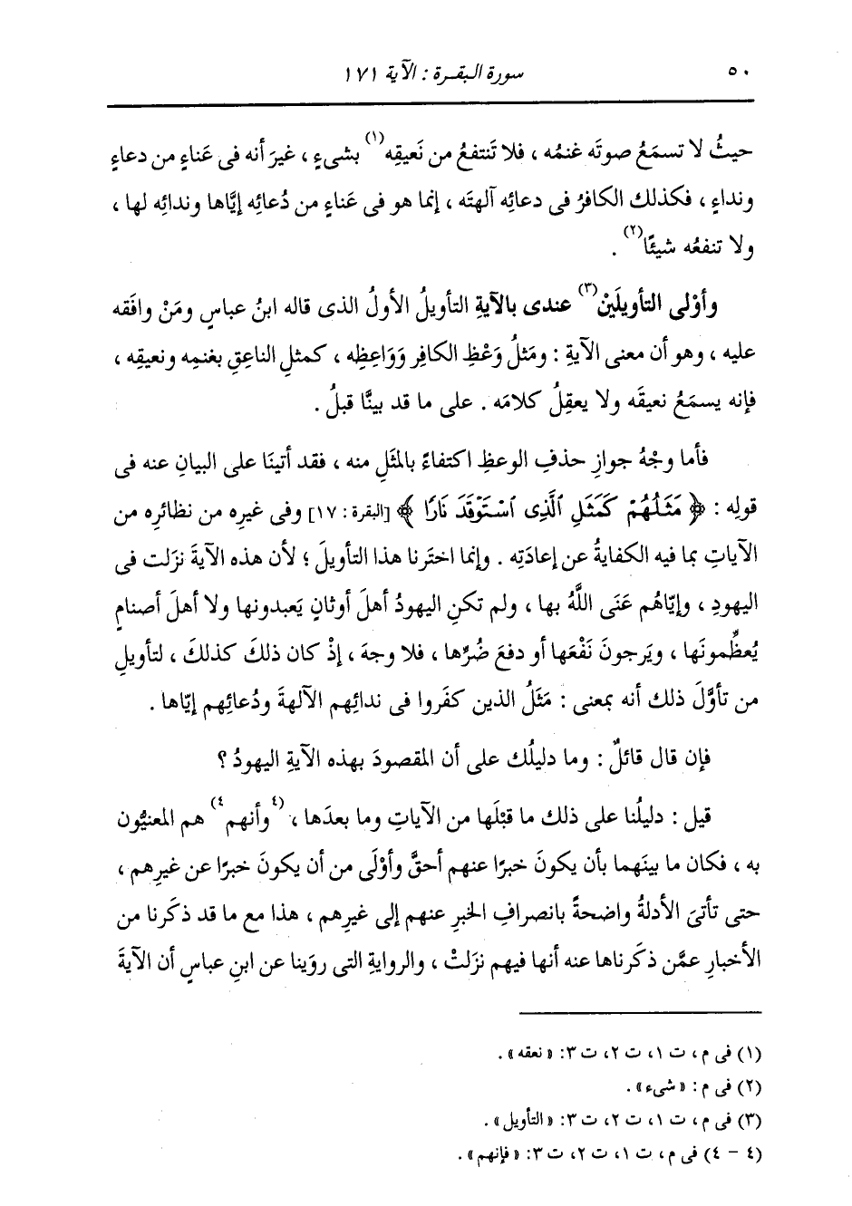 حَيْثُ لَا تَسْمَعُ صَوْتَهُ غَنَمُهُ فَلَا تَنْتَفِعُ مِنْ نَعْقِهِ بِشَيْءٍ غَيْرَ أَنَّهُ فِي عَنَاءٍ مِنْ دُعَاءٍ وَنِدَاءٍ، فَكَذَلِكَ الْكَافِرُ فِي دُعَائِهِ آلِهَتَهُ إِنَّمَا هُوَ فِي عَنَاءٍ مِنْ دُعَائِهِ إِيَّاهَا وَنِدَائِهِ لَهَا، وَلَا يَنْفَعُهُ شَيْءٌ. وَأَوْلَى التَّأْوِيلِ عِنْدِي بِالْآيَةِ التَّأْوِيلُ الْأَوَّلُ الَّذِي قَالَهُ ابْنُ عَبَّاسٍ وَمَنْ وَافَقَهُ عَلَيْهِ، وَهُوَ أَنَّ مَعْنَى الْآيَةِ: وَمَثَلُ وَعْظِ الْكَافِرِ وَوَاعِظِهِ كَمَثَلِ النَّاعِقِ بِغَنَمِهِ وَنَعِيقِهِ، فَإِنَّهُ يَسْمَعُ نَعْقَهُ وَلَا يَعْقِلُ كَلَامَهُ عَلَى مَا قَدْ بَيَّنَّا قَبْلُ. فَأَمَّا وَجْهُ جَوَازِ حَذْفِ «وَعْظِ» اكْتِفَاءٌ بِالْمَثَلِ مِنْهُ فَقَدْ أَتَيْنَا عَلَى الْبَيَانِ عَنْهُ فِي قَوْلِهِ: {مَثَلُهُمْ كَمَثَلِ الَّذِي اسْتَوْقَدَ نَارًا} [البقرة: 17] وَفِي غَيْرِهِ مِنْ نَظَائِرِهِ مِنَ الْآيَاتِ بِمَا فِيهِ الْكِفَايَةُ عَنْ إِعَادَتِهِ. وَإِنَّمَا اخْتَرْنَا هَذَا التَّأْوِيلَ، لِأَنَّ هَذِهِ الْآيَةَ نَزَلَتْ فِي الْيَهُودِ، وَإِيَّاهُمْ عَنَى اللَّهُ تَعَالَى ذِكْرُهُ بِهَا، وَلَمْ تَكُنِ الْيَهُودُ أَهْلَ أَوْثَانٍ يَعْبُدُونَهَا وَلَا أَهْلَ أَصْنَامٍ يُعَظِّمُونَهَا وَيَرْجُونَ نَفْعَهَا أَوْ دَفْعَ ضَرِّهَا. وَلَا وَجْهَ إِذْ كَانَ ذَلِكَ كَذَلِكَ لِتَأْوِيلِ مَنْ تَأَوَّلَ ذَلِكَ أَنَّهُ بِمَعْنَى: مَثَلُ الَّذِينَ كَفَرُوا فِي نِدَائِهِمُ الْآلِهَةَ وَدُعَائِهُمْ إِيَّاهَا. فَإِنْ قَالَ قَائِلٌ: وَمَا دَلِيلُكَ عَلَى أَنَّ الْمَقْصُودَ بِهَذِهِ الْآيَةِ الْيَهُودُ؟ قِيلَ: دَلِيلُنَا عَلَى ذَلِكَ مَا قَبْلَهَا مِنَ الْآيَاتِ وَمَا بَعْدَهَا، فَإِنَّهُمْ هُمُ الْمَعْنِيُّونَ بِهِ، فَكَانَ مَا بَيْنَهُمَا بِأَنْ يَكُونَ خَبَرًا عَنْهُمْ أَحَقُّ وَأَوْلَى مِنْ أَنْ يَكُونَ خَبَرًا عَنْ غَيْرِهِمْ حَتَّى تَأْتِيَ الْأَدِلَّةُ وَاضِحَةً بِانْصِرَافِ الْخَبَرِ عَنْهُمْ إِلَى غَيْرِهِمْ. هَذَا مَعَ مَا ذَكَرْنَا مِنَ الْأَخْبَارِ عَمَّنْ ذَكَرْنَا عَنْهُ أَنَّهَا فِيهِمْ نَزَلَتْ، وَالرِّوَايَةُ الَّتِي رُوِّينَا عَنِ ابْنِ عَبَّاسٍ أَنَّ الْآيَةَ