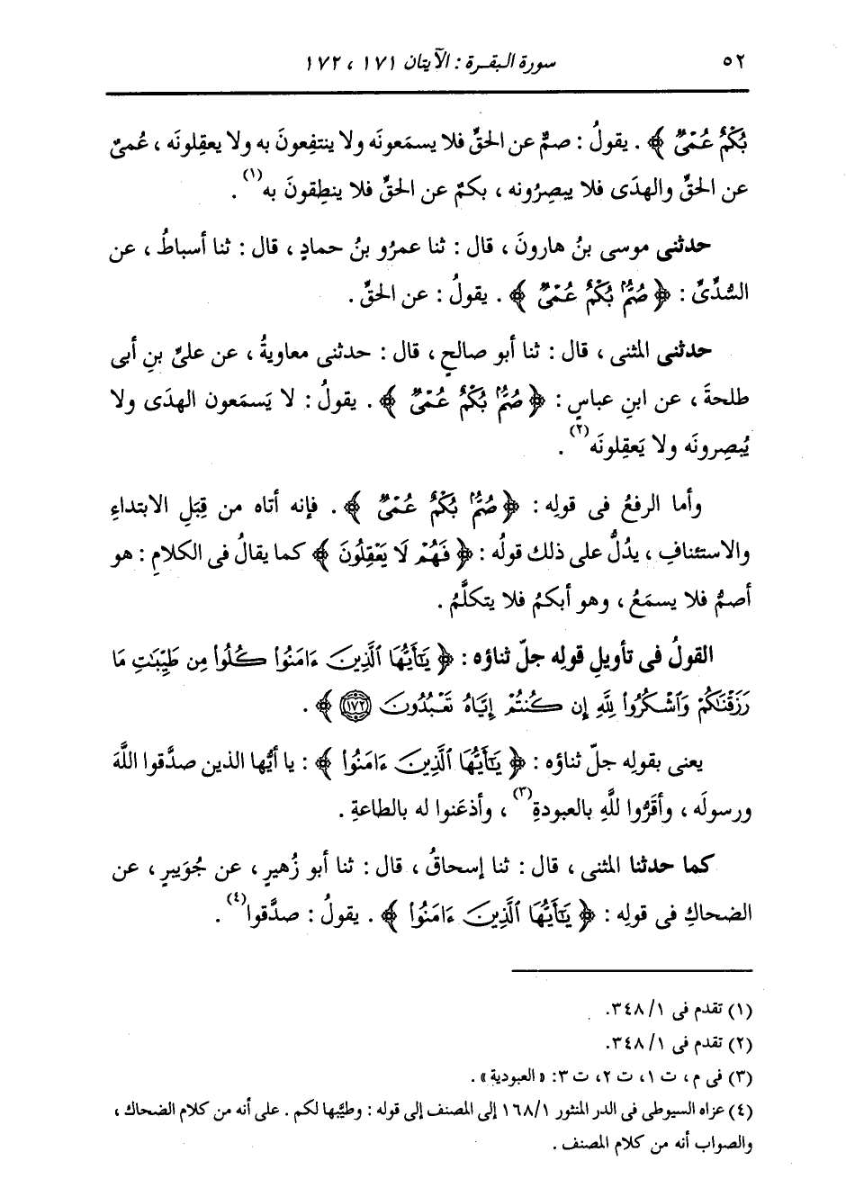 حَدَّثَنِي الْمُثَنَّى، قَالَ: ثنا أَبُو صَالِحٍ، قَالَ: حَدَّثَنِي مُعَاوِيَةُ، عَنْ عَلِيِّ بْنِ أَبِي طَلْحَةَ، عَنِ ابْنِ عَبَّاسٍ: {§صُمٌّ بُكْمٌ عُمْيٌ} [البقرة: 171] يَقُولُ «لَا يَسْمَعُونَ الْهُدَى، وَلَا يُبْصِرُونَهُ، وَلَا يَعْقِلُونَهُ» وَأَمَّا الرَّفْعُ فِي قَوْلِهِ: {صُمٌّ بُكْمٌ عُمْيٌ} [البقرة: 18] فَإِنَّهُ أَتَاهُ مِنْ قِبَلِ الِابْتِدَاءِ وَالِاسْتِئْنَافِ، يَدُلُّ عَلَى ذَلِكَ قَوْلُهُ: {فَهُمْ لَا يَعْقِلُونَ} [البقرة: 171] كَمَا يُقَالُ فِي الْكَلَامِ: هُوَ أَصَمُّ لَا يَسْمَعُ، وَهُوَ أَبْكَمُ لَا يَتَكَلَّمُ