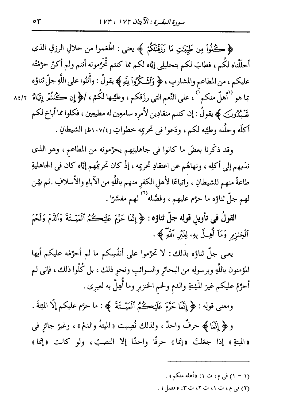 §الْقَوْلُ فِي تَأْوِيلِ قَوْلِهِ تَعَالَى {إِنَّمَا حَرَّمَ عَلَيْكُمُ الْمَيْتَةَ وَالدَّمَ وَلَحْمَ الْخِنْزِيرِ وَمَا أُهِلَّ بِهِ لِغَيْرِ اللَّهِ فَمَنِ اضْطُرَّ غَيْرَ بَاغٍ وَلَا عَادٍ فَلَا إِثْمَ عَلَيْهِ إِنَّ اللَّهَ غَفُورٌ رَحِيمٌ} [البقرة: 173] يَعْنِي تَعَالَى ذِكْرُهُ بِذَلِكَ: لَا تُحَرِّمُوا عَلَى أَنْفُسِكُمْ مَا لَمْ أُحَرِّمْهُ عَلَيْكُمْ أَيُّهَا الْمُؤْمِنُونَ بِاللَّهِ وَبِرَسُولِهِ مِنَ الْبَحَائِرِ، وَالسَّوَائِبِ، وَنَحْوِ ذَلِكَ، بَلْ كُلُوا ذَلِكَ فَإِنِّي لَمْ أُحَرِّمْ عَلَيْكُمْ غَيْرَ الْمَيْتَةِ وَالدَّمِ وَلَحْمِ الْخِنْزِيرِ وَمَا أُهِلَّ بِهِ لِغَيْرِي