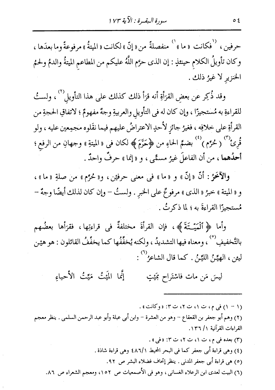 حَرْفَيْنِ وَكَانَتْ مُنْفَصِلَةً مِنْ «إِنَّ» لَكَانَتِ الْمَيْتَةُ مَرْفُوعَةً وَمَا بَعْدَهَا، وَكَانَ تَأْوِيلُ الْكَلَامِ حِينَئِذٍ: إِنَّ الَّذِي حَرَّمَ اللَّهُ عَلَيْكُمْ مِنَ الْمَطَاعِمِ الْمَيْتَةُ وَالدَّمُ وَلَحْمُ الْخِنْزِيرِ لَا غَيْرَ ذَلِكَ. وَقَدْ ذُكِرَ عَنْ بَعْضِ الْقُرَّاءِ أَنَّهُ قَرَأَ ذَلِكَ كَذَلِكَ عَلَى هَذَا التَّأْوِيلِ. وَلَسْتُ لِلْقِرَاءَةِ بِهِ مُسْتَجِيزًا، وَإِنْ كَانَ لَهُ فِي التَّأْوِيلِ وَالْعَرَبِيَّةِ وَجْهٌ مَفْهُومٌ، لِاتِّفَاقِ الْحُجَّةِ مِنَ الْقُرَّاءِ عَلَى خِلَافِهِ، فَغَيْرُ جَائِزٍ لِأَحَدٍ الِاعْتِرَاضُ عَلَيْهِمْ فِيمَا نَقَلُوهُ مُجْمِعِينَ عَلَيْهِ، وَلَوْ قُرِئَ فِي «حُرِّمَ» بِضَمِّ الْحَاءِ مِنْ «حَرَّمَ» لَكَانَ فِي الْمَيْتَةِ وَجْهَانِ مِنَ الرَّفْعِ: أَحَدُهُمَا مِنْ أَنِّ الْفَاعِلَ غَيْرُ مُسَمًّى، و «إِنَّمَا» حَرْفٌ وَاحِدٌ. وَالْآخَرُ «إِنَّ» وَ «مَا» فِي مَعْنَى حَرْفَيْنٍ، وَ «حَرَّمَ» مِنْ صِلَةِ «مَا» ، وَالْمَيْتَةُ خَبَرُ «الَّذِي» مَرْفُوعٌ عَلَى الْخَبَرِ وَلَسْتُ وَإِنْ كَانَ لِذَلِكَ أَيْضًا وَجْهٌ مُسْتَجِيزًا لِلْقِرَاءَةِ بِهِ لِمَا ذَكَرْتُ. وَأَمَّا الْمَيْتَةُ فَإِنَّ الْقُرَّاءَ مُخْتَلِفَةٌ فِي قِرَاءَتِهَا، فَقَرَأَهَا بَعْضُهُمْ بِالتَّخْفِيفِ، وَمَعْنَاهُ فِيهَا التَّشْدِيدُ، وَلَكِنَّهُ يُخَفِّفُهَا كَمَا يُخَفِّفُ الْقَائِلُونَ: هُوَ هَيْنٌ لَيْنٌ، الْهَيْنُ اللَّيْنُ، كَمَا قَالَ الشَّاعِرُ: