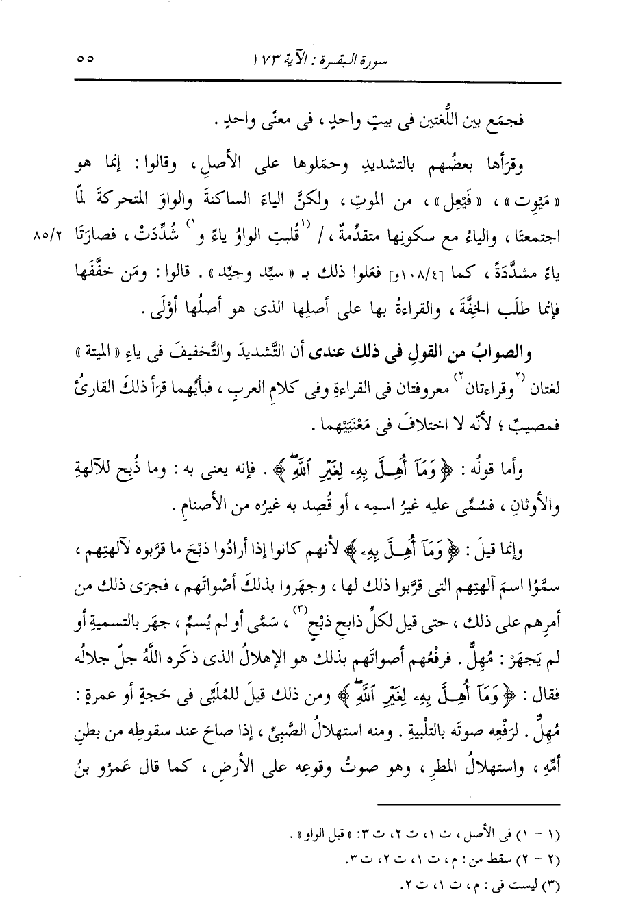 فَجَمَعَ بَيْنَ اللُّغَتَيْنِ فِي بَيْتٍ وَاحِدٍ فِي مَعْنًى وَاحِدٍ. وَقَرَأَهَا بَعْضُهُمْ بِالتَّشْدِيدِ وَحَمَلُوهَا عَلَى الْأَصْلِ، وَقَالُوا: إِنَّمَا هُوَ «مَيْوِتٌ» ، فَيْعِلٌ مِنَ الْمَوْتِ، وَلَكِنَّ الْيَاءَ السَّاكِنَةَ وَالْوَاوَ الْمُتَحَرِّكَةَ لَمَّا اجْتَمَعَتَا وَالْيَاءُ مَعَ سُكُونِهَا مُتَقَدِّمَةٌ قُلِبَتِ الْوَاوُ يَاءً وَشُدِّدَتْ فَصَارَتَا يَاءً مُشَدَّدَةً، كَمَا فَعَلُوا ذَلِكَ فِي سَيِّدٍ وَجَيِّدٍ. قَالُوا: وَمَنْ خَفَّفَهَا فَإِنَّمَا طَلَبَ الْخِفَّةَ. وَالْقِرَاءَةُ بِهَا عَلَى أَصْلِهَا الَّذِي هُوَ أَصْلُهَا أَوْلَى. وَالصَّوَابُ مِنَ الْقَوْلِ فِي ذَلِكَ عِنْدِي أَنَّ التَّخْفِيفَ وَالتَّشْدِيدَ فِي يَاءِ الْمَيْتَةِ لُغَتَانِ مَعْرُوفَتَانِ فِي الْقِرَاءَةِ وَفِي كَلَامِ الْعَرَبِ، فَبِأَيِّهِمَا قَرَأَ ذَلِكَ الْقَارِئُ فَمُصِيبٌ؛ لِأَنَّهُ لَا اخْتِلَافَ فِي مَعْنَيَيْهِمَا