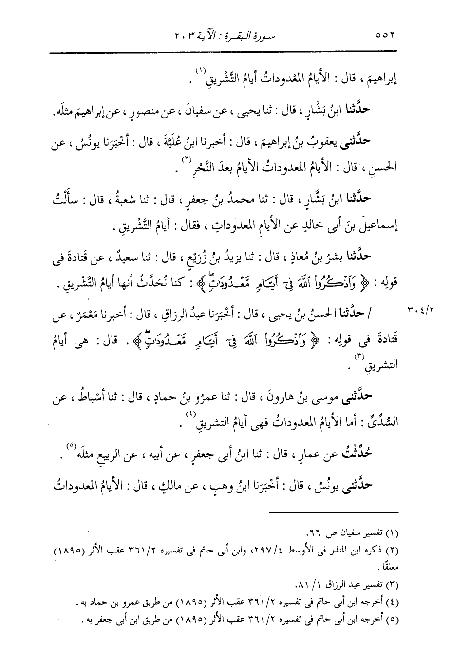 حَدَّثَنَا بِشْرُ بْنُ مُعَاذٍ، قَالَ: ثنا يَزِيدُ بْنُ زُرَيْعٍ، قَالَ: ثنا سَعِيدٌ، عَنْ قَتَادَةَ، قَوْلُهُ: " {§وَاذْكُرُوا اللَّهَ فِي أَيَّامٍ مَعْدُودَاتٍ} [البقرة: 203] كُنَّا نُحَدِّثُ أَنَّهَا أَيَّامُ التَّشْرِيقِ "