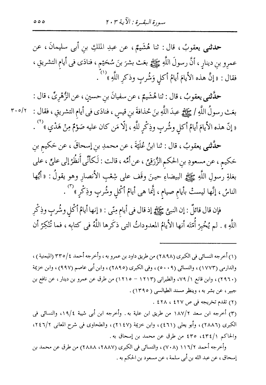 وَحَدَّثَنِي يَعْقُوبُ، قَالَ: ثني هُشَيْمٌ، عَنْ عَبْدِ الْمَلِكِ بْنِ أَبِي سُلَيْمَانَ، عَنْ عَمْرِو بْنِ دِينَارٍ: أَنَّ رَسُولَ اللَّهِ صَلَّى اللهُ عَلَيْهِ وَسَلَّمَ بَعَثَ بِشْرَ بْنَ سُحَيْمٍ، فَنَادَى فِي أَيَّامِ التَّشْرِيقِ، فَقَالَ: «إِنَّ §هَذِهِ الْأَيَّامَ أَيَّامُ أَكْلٍ، وَشُرْبٍ، وَذِكْرِ اللَّهِ»