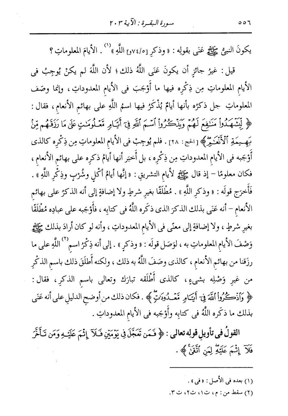 §الْقَوْلُ فِي تَأْوِيلِ قَوْلِهِ تَعَالَى: {فَمَنْ تَعَجَّلَ فِي يَوْمَيْنِ فَلَا إِثْمَ عَلَيْهِ وَمَنْ تَأَخَّرَ فَلَا إِثْمَ عَلَيْهِ لِمَنِ اتَّقَى} [البقرة: 203]-[557]- اخْتَلَفَ أَهْلُ التَّأْوِيلِ فِي تَأْوِيلِ ذَلِكَ، فَقَالَ بَعْضُهُمْ: مَعْنَاهُ: فَمَنْ تَعَجَّلَ فِي يَوْمَيْنِ مِنْ أَيَّامِ التَّشْرِيقِ لِلنَّفْرِ فِي الْيَوْمِ الثَّانِي فَلَا إِثْمَ عَلَيْهِ فِي نَفْرِهِ. وَتَعَجُّلُهُ فِي النَّفْرِ، وَمَنْ تَأَخَّرَ عَنِ النَّفْرِ فِي الْيَوْمِ الثَّانِي مِنْ أَيَّامِ التَّشْرِيقِ إِلَى الْيَوْمِ الثَّالِثِ حَتَّى يَنْفِرَ فِي الْيَوْمِ الثَّالِثِ فَلَا إِثْمَ عَلَيْهِ فِي تَأَخُّرِهِ. ذِكْرُ مَنْ قَالَ ذَلِكَ