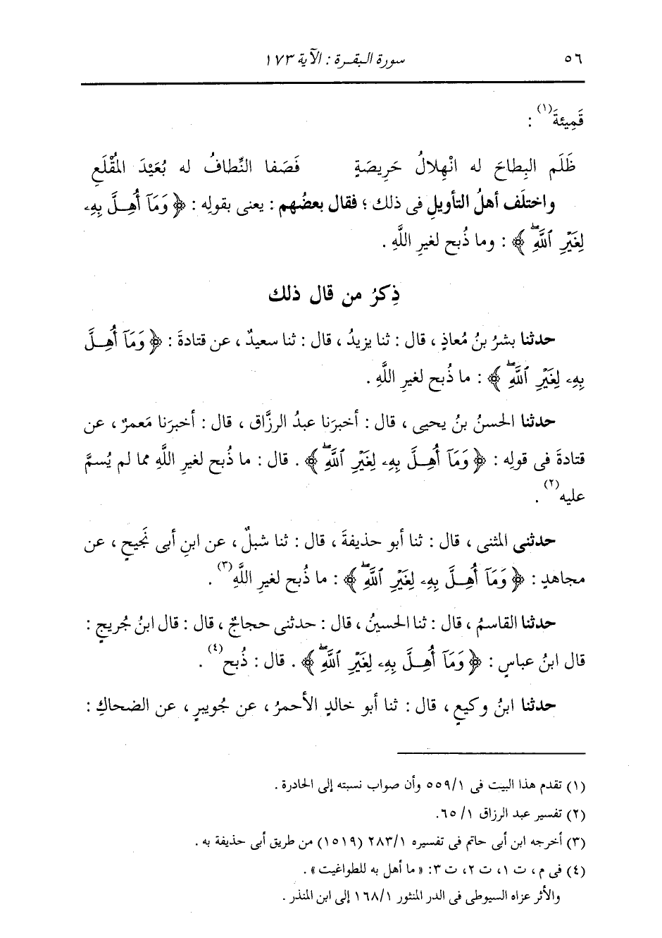 حَدَّثَنَا الْقَاسِمُ، قَالَ: ثنا الْحُسَيْنُ، قَالَ: حَدَّثَنِي حَجَّاجٌ، قَالَ: قَالَ ابْنُ جُرَيْجٍ، قَالَ ابْنُ عَبَّاسٍ، فِي قَوْلِهِ " {§وَمَا أُهِلَّ بِهِ لِغَيْرِ اللَّهِ} [البقرة: 173] قَالَ: مَا أُهِلَّ بِهِ لِلطَّوَاغِيتِ "