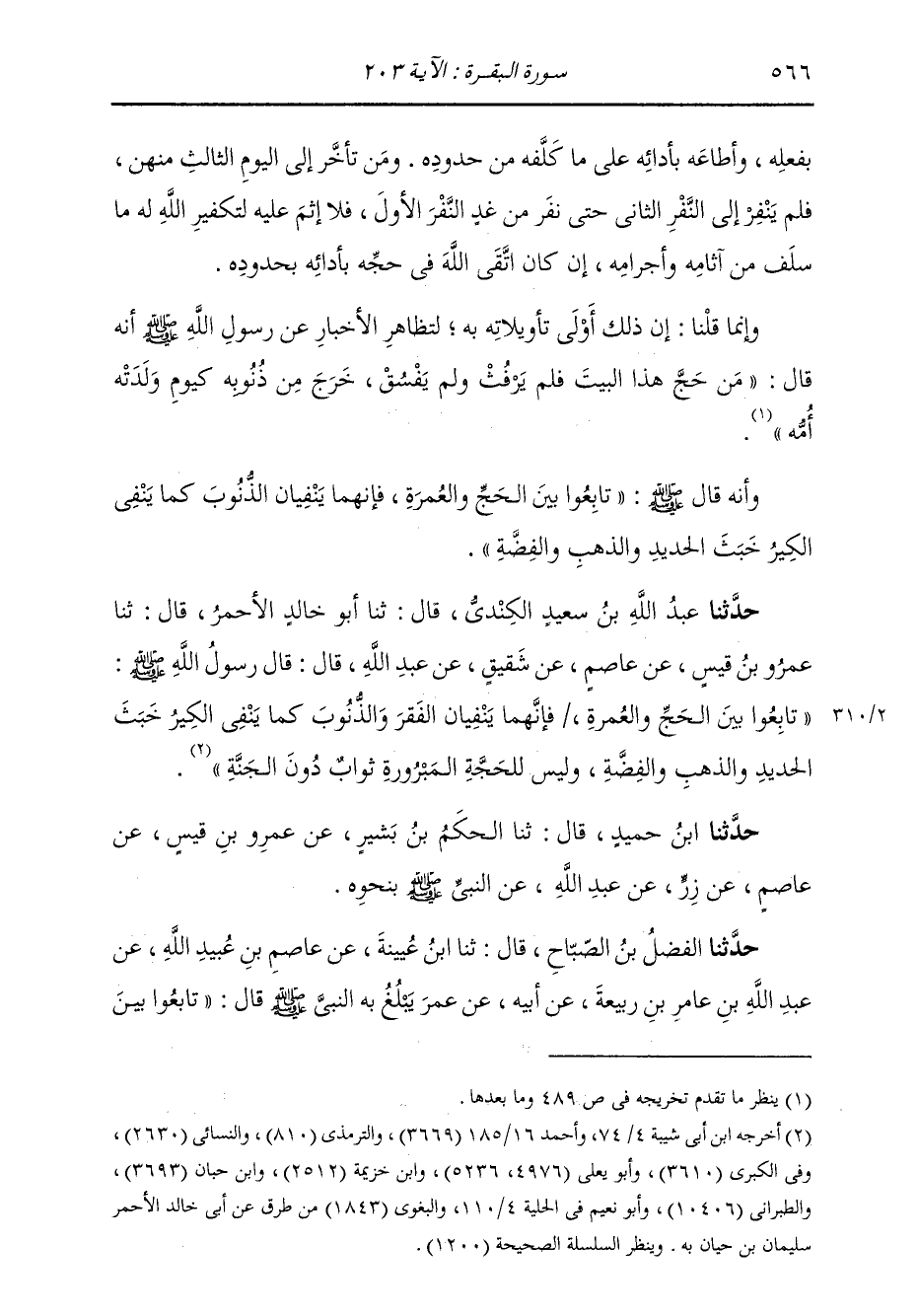 حَدَّثَنَا عَبْدُ اللَّهِ بْنُ سَعِيدٍ الْكِنْدِيُّ، قَالَ: ثنا أَبُو خَالِدٍ الْأَحْمَرُ، قَالَ: ثنا عَمْرُو بْنُ قَيْسٍ، عَنْ عَاصِمٍ، عَنْ شَقِيقٍ، عَنْ عَبْدِ اللَّهِ، قَالَ: قَالَ رَسُولُ اللَّهِ صَلَّى اللهُ عَلَيْهِ وَسَلَّمَ: «§تَابِعُوا بَيْنَ الْحَجِّ، وَالْعُمْرَةِ فَإِنَّهُمَا يَنْفِيَانِ الْفَقْرَ، وَالذُّنُوبَ كَمَا يَنْفِي الْكِيرُ خَبَثَ الْحَدِيدِ، وَالذَّهَبِ، وَالْفِضَّةِ، وَلَيْسَ لِلْحَجَّةِ الْمَبْرُورَةِ ثَوَابٌ دُونَ الْجَنَّةِ» حَدَّثَنَا ابْنُ حُمَيْدٍ، قَالَ: ثنا الْحَكَمُ بْنُ بَشِيرٍ، عَنْ عَمْرِو بْنِ قَيْسٍ، عَنْ عَاصِمٍ، عَنْ زِرٍّ، عَنْ عَبْدِ اللَّهِ عَنِ النَّبِيِّ صَلَّى اللهُ عَلَيْهِ وَسَلَّمَ بِنَحْوِهِ