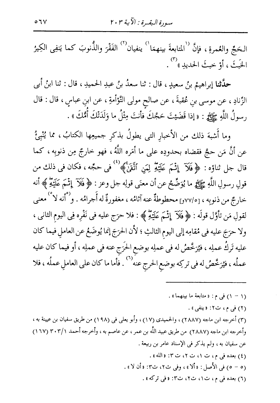حَدَّثَنَا إِبْرَاهِيمُ بْنُ سَعِيْدٍ، قَالَ: ثنا سَعْدُ بْنُ عَبْدِ الْحَمِيدِ، قَالَ: ثنا ابْنُ أَبِي الزِّنَادِ، عَنْ مُوسَى بْنِ عُقْبَةَ، عَنْ صَالِحٍ، مَوْلَى التَّوْأَمَةِ، عَنِ ابْنِ عَبَّاسٍ، قَالَ: قَالَ رَسُولُ اللَّهِ صَلَّى اللهُ عَلَيْهِ وَسَلَّمَ: «§إِذَا قَضَيْتَ حَجَّكَ فَأَنْتَ مِثْلُ مَا وَلَدَتْكَ أُمُّكَ» وَمَا أَشْبَهَ ذَلِكَ مِنَ الْأَخْبَارِ الَّتِي يَطُولُ بِذِكْرِ جَمِيعَهَا الْكِتَابُ، مِمَّا يُنْبِئُ عَنْهُ أَنَّ مَنَ حَجَّ فَقَضَاهُ بِحُدُودِهِ عَلَى مَا أَمَرَهُ اللَّهُ، فَهُوَ خَارِجٌ مِنْ ذُنُوبِهِ، كَمَا قَالَ جَلَّ ثَنَاؤُهُ: {فَلَا إِثْمَ عَلَيْهِ لِمَنِ اتَّقَى} [البقرة: 203] اللَّهَ فِي حَجِّهِ. فَكَانَ فِي ذَلِكَ مِنْ قَوْلِ رَسُولِ اللَّهِ صَلَّى اللهُ عَلَيْهِ وَسَلَّمَ مَا يُوضِّحُ عَنْ أَنَّ مَعْنَى قَوْلِهِ جَلَّ وَعَزَّ: {فَلَا إِثْمَ عَلَيْهِ} [البقرة: 173] أَنَّهُ خَارِجٌ مِنْ ذُنُوبِهِ، مَحْطُوطَةٌ عَنْهُ آثَامُهُ، مَغْفُورَةٌ لَهُ أَجْرَامُهُ. وَأَنَّهُ لَا مَعْنَى لِقَوْلِ مَنْ تَأَوَّلَ قَوْلَهُ: {فَلَا إِثْمَ عَلَيْهِ} [البقرة: 173] فَلَا حَرَجَ عَلَيْهِ فِي نَفْرِهِ فِي الْيَوْمِ الثَّانِي، وَلَا حَرَجَ عَلَيْهِ فِي مَقَامِهِ إِلَى الْيَوْمِ الثَّالِثِ؛ لِأَنَّ الْحَرَجَ إِنَّمَا يُوضَعُ عَنِ الْعَامِلِ فِيمَا كَانَ عَلَيْهِ تَرْكُ عَمَلِهِ فَيُرَخَّصُ لَهُ فِي عَمَلِهِ بِوَضْعِ الْحَرَجِ عَنْهُ فِي عَمَلِهِ، أَوْ فِيمَا كَانَ عَلَيْهِ عَمَلُهُ، فَيُرَخَّصُ لَهُ فِي تَرْكِهِ بِوَضْعِ الْحَرَجِ عَنْهُ فِي تَرْكِهِ. فَأَمَّا مَا عَلَى الْعَامِلِ عَمَلُهُ فَلَا