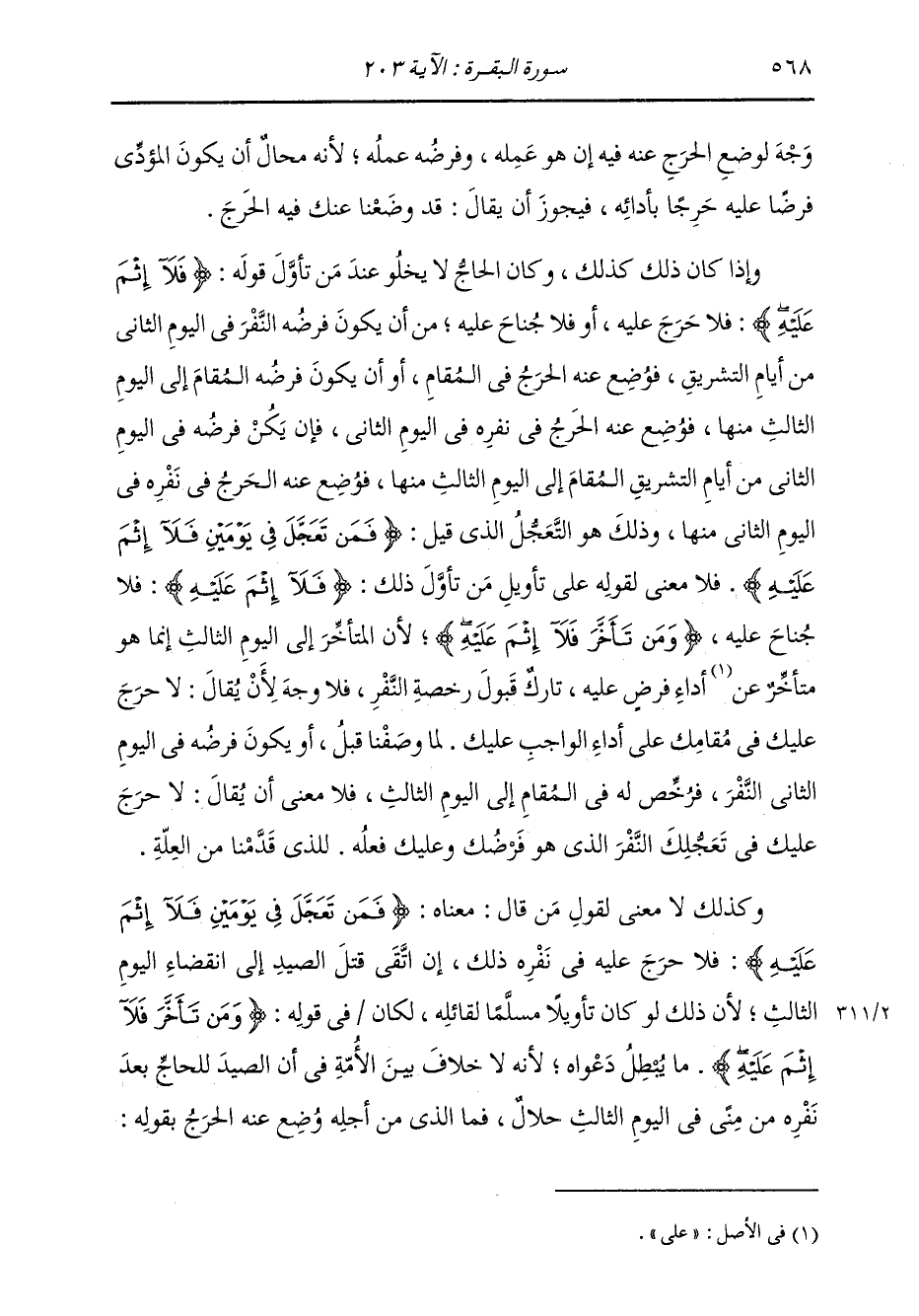 وَجْهَ لِوَضْعِ الْحَرَجِ عَنْهُ فِيهِ إِنْ هُوَ عَمِلَهُ، وَفَرْضُهُ عَمَلُهُ، لِأَنَّهُ مُحَالٌ أَنْ يَكُونَ الْمُؤَدِّي فَرْضًا عَلَيْهِ حَرَجًا بِأَدَائِهِ، فَيَجُوزُ أَنْ يُقَالَ: قَدْ وَضَعْنَا عَنْكَ فِيهِ الْحَرَجَ. وَإِذْ كَانَ ذَلِكَ كَذَلِكَ، وَكَانَ الْحَاجُّ لَا يَخْلُو عِنْدَ مَنْ تَأَوَّلَ قَوْلَهُ: {فَلَا إِثْمَ عَلَيْهِ} [البقرة: 173] فَلَا حَرَجَ عَلَيْهِ، أَوْ فَلَا جُنَاحَ عَلَيْهِ مِنْ أَنْ يَكُونَ فَرْضُهُ النَّفْرَ فِي الْيَوْمِ الثَّانِي مِنْ أَيَّامِ التَّشْرِيقِ، فَوَضَعَ عَنْهُ الْحَرَجَ فِي الْمَقَامِ، أَوْ أنْ يَكُونِ فَرْضُهُ الْمَقَامُ إِلَى الْيَوْمِ الثَّالِثِ، فَوَضَعَ عَنْهُ الْحَرَجَ فِي النَّفْرِ فِي الْيَوْمِ الثَّانِي، فَإِنْ يَكُنْ فَرْضُهُ فِي الْيَوْمِ الثَّانِي مِنْ أَيَّامِ التَّشْرِيقِ الْمُقَامَ إِلَى الْيَوْمِ الثَّالِثِ مِنْهَا، فَوَضَعَ عَنْهُ الْحَرَجَ فِي نَفْرِهِ فِي الْيَوْمِ الثَّانِي مِنْهَا، وَذَلِكَ هُوَ التَّعْجِيلُ الَّذِي قِيلَ: {فَمَنْ تَعَجَّلَ فِي يَوْمَيْنِ فَلَا إِثْمَ عَلَيْهِ} [البقرة: 203] فَلَا مَعْنَى لِقَوْلِهِ عَلَى تَأْوِيلِ مَنْ تَأَوَّلَ ذَلِكَ: {فَلَا إِثْمَ عَلَيْهِ} [البقرة: 173] فَلَا جُنَاحَ عَلَيْهِ {وَمَنْ تَأَخَّرَ فَلَا إِثْمَ عَلَيْهِ} [البقرة: 203] لِأَنَّ الْمُتَأَخِّرَ إِلَى الْيَوْمِ الثَّالِثِ إِنَّمَا هُوَ مُتَأَخَّرٌ عَنْ أَدَاءِ فَرْضٍ عَلَيْهِ تَارِكٌ قَبُولَ رُخْصَةِ النَّفْرِ، فَلَا وَجْهَ لِأَنْ يُقَالَ: لَا حَرَجَ عَلَيْكَ فِي مَقَامِكَ عَلَى أَدَاءِ الْوَاجِبِ عَلَيْكَ، لِمَا وَصَفْنَا قَبْلُ، أَوْ يَكُونُ فَرْضُهُ فِي الْيَوْمِ الثَّانِي النَّفْرَ، فَرُخِّصَ لَهُ فِي الْمَقَامِ إِلَى الْيَوْمِ الثَّالِثِ؛ فَلَا مَعْنَى أَنْ يُقَالَ: لَا حَرَجَ عَلَيْكَ فِي تَعَجُّلِكَ النَّفْرَ الَّذِي هُوَ فَرْضُكَ وَعَلَيْكَ فِعْلُهُ لِلَّذِي قَدَّمْنَا مِنَ الْعِلَّةِ وَكَذَلِكَ لَا مَعْنَى لِقَوْلِ مَنْ قَالَ: مَعْنَاهُ: {فَمَنْ تَعَجَّلَ فِي يَوْمَيْنِ فَلَا إِثْمَ عَلَيْهِ} [البقرة: 203] وَلَا حَرَجَ عَلَيْهِ فِي نَفْرِهِ ذَلِكَ، إِنِ اتَّقَى قَتْلَ الصَّيْدِ إِلَى انْقِضَاءِ الْيَوْمِ الثَّالِثِ؛ لِأَنَّ ذَلِكَ لَوْ كَانَ تَأْوِيلًا مُسَلَّمًا لِقَائِلِهِ لَكَانَ فِي قَوْلِهِ: {وَمَنْ تَأَخَّرَ فَلَا إِثْمَ عَلَيْهِ} [البقرة: 203] مَا يُبْطِلُ دَعْوَاهُ، لِأَنَّهُ لَا خِلَافَ بَيْنَ الْأُمَّةِ فِي أَنَّ الصَّيْدَ لِلْحَاجِّ بَعْدَ نَفْرِهِ مِنْ مِنًى فِي الْيَوْمِ الثَّالِثِ حَلَالٌ، فَمَا الَّذِي مِنْ أَجْلِهِ وَضَعَ عَنْهُ الْحَرَجَ فِي قَوْلِهِ