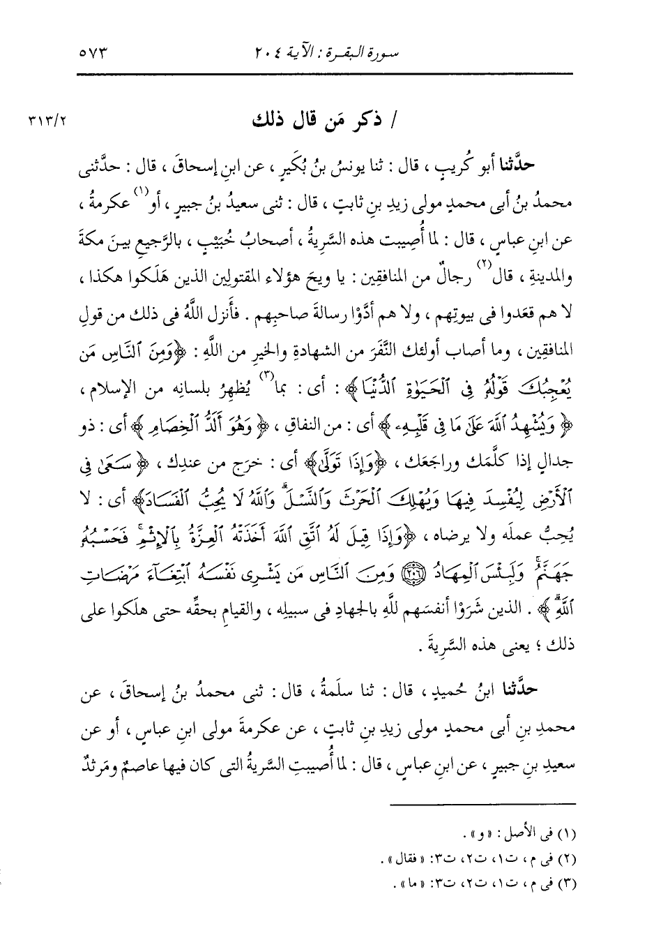 ذِكْرُ مَنْ قَالَ ذَلِكَ حَدَّثَنَا أَبُو كُرَيْبٍ، قَالَ: ثنا يُونُسُ بْنُ بُكَيْرٍ، عَنْ ابنِ إِسْحَاقَ، قَالَ: حَدَّثَنِي مُحَمَّدُ بْنُ أَبِي مُحَمَّدٍ، مَوْلَى زَيْدِ بْنِ ثَابِتٍ، قَالَ: ثني سَعِيدُ بْنُ جُبَيْرٍ أَوْ عِكْرِمَةُ، عَنِ ابْنِ عَبَّاسٍ، قَالَ " لَمَّا أُصِيبَتْ هَذِهِ السَّرِيَّةُ أَصْحَابُ خُبَيْبٍ بِالرَّجِيعِ بَيْنَ مَكَّةَ، وَالْمَدِينَةِ، فَقَالَ رِجَالٌ مِنَ الْمُنَافِقِينَ: يَا وَيْحَ هَؤُلَاءِ الْمَقْتُولِينَ الَّذِينَ هَلَكُوا هَكَذَا، لَا هُمْ قَعَدُوا فِي بُيُوتِهِمْ، وَلَا هُمْ أَدُّوا رِسَالَةَ صَاحِبِهِمْ فَأَنْزَلَ اللَّهُ عَزَّ وَجَلَّ فِي ذَلِكَ مِنْ قَوْلِ الْمُنَافِقِينَ، وَمَا أَصَابَ أُولَئِكَ النَّفَرَ فِي الشَّهَادَةِ وَالْخَيْرِ مِنَ اللَّهِ: {§وَمِنَ النَّاسِ مَنْ يُعْجِبُكَ قَوْلُهُ فِي الْحَيَاةِ الدُّنْيَا} [البقرة: 204] أَيْ مَا يُظْهِرُ بِلِسَانِهِ مِنَ الْإِسْلَامِ {وَيُشْهِدُ اللَّهَ عَلَى مَا فِي قَلْبِهِ} [البقرة: 204] أَيْ مِنَ النِّفَاقِ {وَهُوَ أَلَدُ الْخِصَامِ} [البقرة: 204] أَيْ ذُو جِدَالٍ إِذَا كَلَّمَكَ وَرَاجَعَكَ {وَإِذَا تَوَلَّى} [البقرة: 205] أَيْ خَرَجَ مِنْ عِنْدَكِ {سَعَى فِي الْأَرْضِ لِيُفْسِدَ فِيهَا وَيُهْلِكَ الْحَرْثَ وَالنَّسْلَ وَاللَّهُ لَا يُحِبُّ الْفَسَادَ} [البقرة: 205] أَيْ لَا يُحِبُّ عَمَلُهُ وَلَا يَرْضَاهُ {وَإِذَا قِيلَ لَهُ اتَّقِ اللَّهَ أَخَذَتْهُ الْعِزَّةُ بِالْإِثْمِ فَحَسْبُهُ جَهَنَّمَ وَلَبِئْسَ الْمِهَادُ وَمِنَ النَّاسِ مِنْ يَشْرِي نَفْسَهُ ابْتِغَاءَ مَرْضَاتِ اللَّهِ} [البقرة: 206] الَّذِينَ شَرَوْا أَنْفُسَهُمْ لِلَّهِ بِالْجِهَادِ فِي سَبِيلِ اللَّهِ، وَالْقِيَامِ بِحَقِّهِ حَتَّى هَلَكُوا عَلَى ذَلِكَ يَعْنِي هَذِهِ السَّرِيَّةَ " حَدَّثَنَا ابْنُ حُمَيْدٍ، قَالَ: ثنا سَلَمَةُ، قَالَ: ثني مُحَمَّدُ بْنُ إِسْحَاقَ، عَنْ مُحَمَّدِ بْنِ أَبِي مُحَمَّدٍ، مَوْلَى زَيْدِ بْنِ ثَابِتٍ، عَنْ عِكْرِمَةَ مَوْلَى ابْنِ عَبَّاسٍ أَوْ عَنْ سَعِيدِ بْنِ جُبَيْرٍ، عَنِ ابْنِ عَبَّاسٍ، قَالَ: «لَمَّا أُصِيبَتِ السَّرِيَّةُ الَّتِي كَانَ فِيهَا عَاصِمٌ، وَمَرْثَدٌ، -[574]- بِالرَّجِيعِ، قَالَ رِجَالٌ مِنَ الْمُنَافِقِينَ، ثُمَّ ذَكَرَ نَحْوَ حَدِيثِ أَبِي كُرَيْبٍ» وَقَالَ آخَرُونَ: بَلْ عَنَى بِذَلِكَ جَمِيعَ الْمُنَافِقِينَ، وَعَنَى بِقَوْلِهِ: {وَمِنَ النَّاسِ مَنْ يُعْجِبُكَ قَوْلُهُ فِي الْحَيَاةِ الدُّنْيَا وَيُشْهِدُ اللَّهَ عَلَى مَا فِي قَلْبِهِ} [البقرة: 204] اخْتِلَافَ سَرِيرَتِهِ، وَعَلَانِيَتِهِ