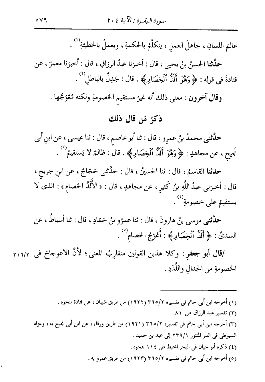 حَدَّثَنَا الْحَسَنُ بْنُ يَحْيَى، قَالَ: أَخْبَرَنَا عَبْدُ الرَّزَّاقِ، قَالَ: أَخْبَرَنَا مَعْمَرٌ، عَنْ قَتَادَةَ، فِي قَوْلِهِ: " {§وَهُوَ أَلَدُ الْخِصَامِ} [البقرة: 204] قَالَ: جَدِلٌ بِالْبَاطِلِ " وَقَالَ آخَرُونَ: مَعْنَى ذَلِكَ أَنَّهُ غَيْرُ مُسْتَقِيمِ الْخُصُومَةِ، وَلَكِنَّهُ مُعْوَجُّهَا