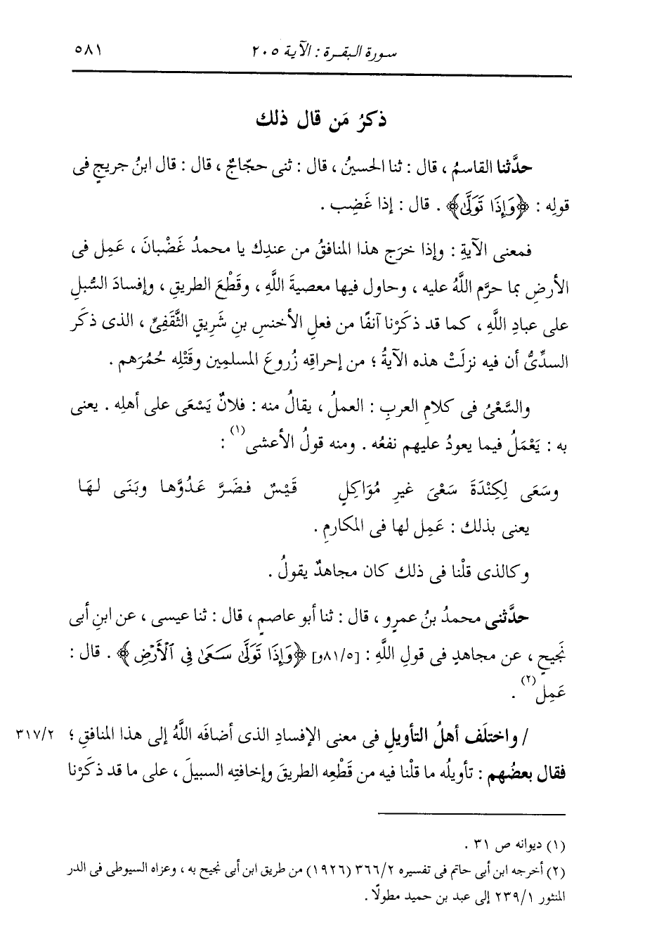 ذِكْرُ مَنْ قَالَ ذَلِكَ حَدَّثَنَا الْقَاسِمُ، قَالَ: ثنا الْحُسَيْنُ، قَالَ: ثني حَجَّاجٌ قَالَ: قَالَ ابْنُ جُرَيْجٍ، فِي قَوْلِهِ: " {§وَإِذَا تَوَلَّى} [البقرة: 205] قَالَ: إِذَا غَضِبَ " فَمَعْنَى الْآيَةِ: وَإِذَا خَرَجَ هَذَا الْمُنَافِقُ مِنْ عِنْدِكَ يَا مُحَمَّدُ غَضْبَانَ عَمِلَ فِي الْأَرْضِ بِمَا حَرَّمَ اللَّهُ عَلَيْهِ، وَحَاوَلَ فِيهَا مَعْصِيَةَ اللَّهِ، وَقَطْعَ الطَّرِيقِ، وَإِفْسَادَ السَّبِيلِ عَلَى عِبَادِ اللَّهِ، كَمَا قَدْ ذَكَرْنَا آنِفًا مِنْ فِعْلِ الْأَخْنَسِ بْنِ شَرِيقٍ الثَّقَفِيِّ الَّذِي ذَكَرَ السُّدِّيُّ أَنَّ فِيهِ نَزَلَتْ هَذِهِ الْآيَةُ مِنْ إِحْرَاقِهِ زَرْعَ الْمُسْلِمِينَ وَقَتْلِهِ حُمُرَهُمْ، وَالسَّعْي فِي كَلَامِ الْعَرَبِ الْعَمَلُ، يُقَالُ مِنْهُ: فُلَانٌ يَسْعَى عَلَى أَهْلِهِ، يَعْنِي بِهِ يَعْمَلُ فِيمَا يَعُودُ عَلَيْهِمْ نَفْعُهُ؛ وَمِنْهُ قَوْلُ الْأَعْشَى: