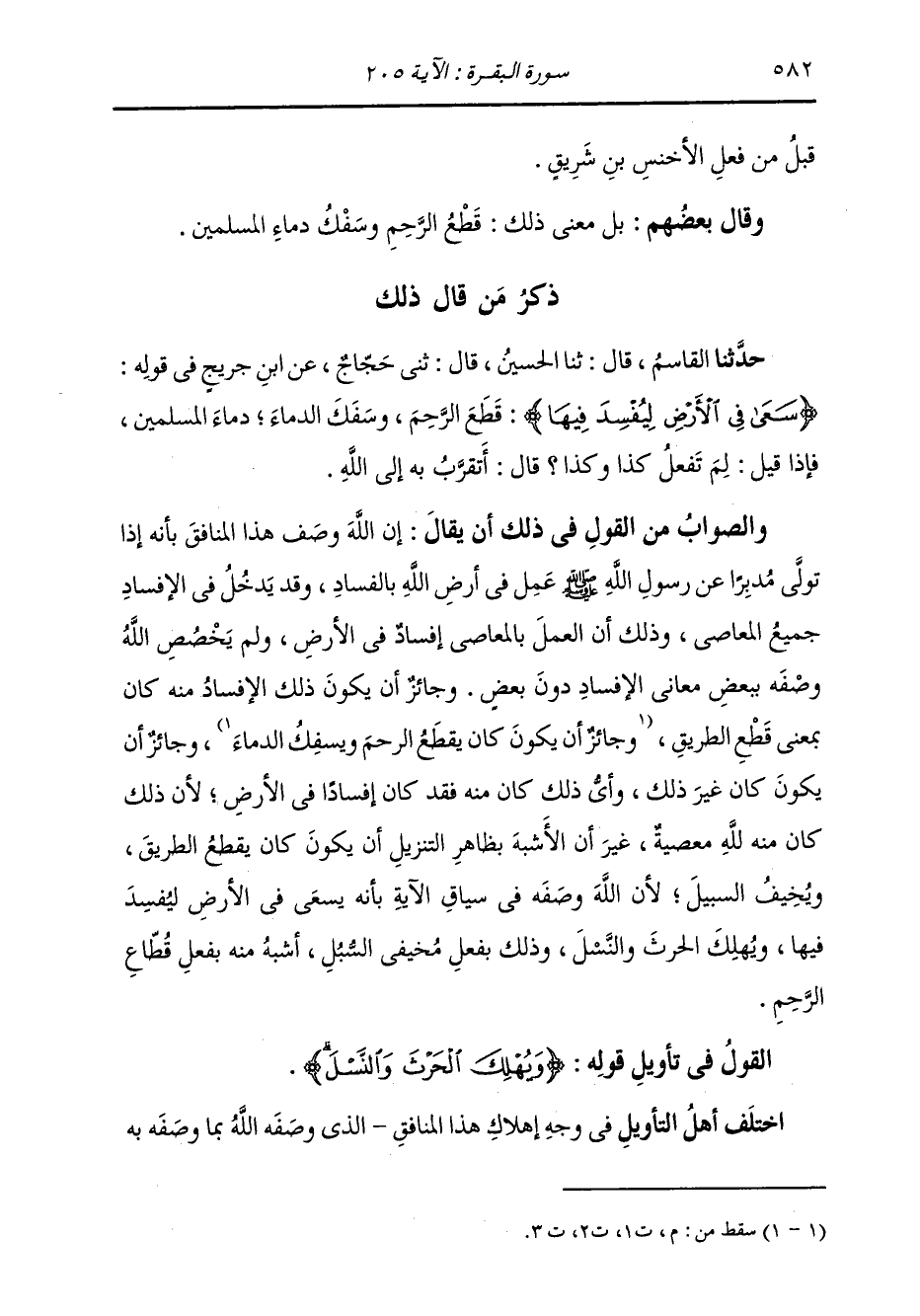ذِكْرُ مَنْ قَالَ ذَلِكَ حَدَّثَنَا الْقَاسِمُ، قَالَ: ثنا الْحُسَيْنُ، قَالَ: ثني حَجَّاجٌ، عَنِ ابْنِ جُرَيْجٍ، فِي قَوْلِهِ: " {§سَعَى فِي الْأَرْضِ لِيُفْسِدَ فِيهَا} [البقرة: 205] قَطَعَ الرَّحِمَ، وَسَفَكَ الدِّمَاءَ، دِمَاءَ الْمُسْلِمِينَ، فَإِذَا قِيلَ: لِمَ تَفْعَلُ كَذَا وَكَذَا؟ قَالَ أَتَقَرَّبُ بِهِ إِلَى اللَّهِ عَزَّ وَجَلَّ " وَالصَّوَابُ مِنَ الْقَوْلِ فِي ذَلِكَ أَنْ يُقَالَ: إِنَّ اللَّهَ تَبَارَكَ وَتَعَالَى وَصَفَ هَذَا الْمُنَافِقَ بِأَنَّهُ إِذَا تَوَلَّى مُدْبِرًا عَنْ رَسُولِ اللَّهِ صَلَّى اللهُ عَلَيْهِ وَسَلَّمَ عَمِلَ فِي أَرْضِ اللَّهِ بِالْفَسَادِ. وَقَدْ يَدْخُلُ فِي الْإِفْسَادِ جَمِيعُ الْمَعَاصِي، وَذَلِكَ أَنَّ الْعَمَلَ بِالْمَعَاصِي إِفْسَادٌ فِي الْأَرْضِ، فَلَمْ يُخَصِّصِ اللَّهُ وَصْفَهُ بِبَعْضِ مَعَانِي الْإِفْسَادِ دُونَ بَعْضٍ. وَجَائِزٌ أَنْ يَكُونَ ذَلِكَ الْإِفْسَادُ مِنْهُ كَانَ بِمَعْنَى قَطْعِ الطَّرِيقِ، وَجَائِزٌ أَنْ يَكُونَ غَيْرَ ذَلِكَ، وَأَيُّ ذَلِكَ كَانَ " مِنْهُ فَقَدْ كَانَ إِفْسَادًا فِي الْأَرْضِ، لِأَنَّ ذَلِكَ مِنْهُ لِلَّهِ عَزَّ وَجَلَّ مَعْصِيَةٌ. غَيْرَ أَنَّ الْأَشْبَهَ بِظَاهِرِ التَّنْزِيلِ أَنْ يَكُونَ كَانَ يَقْطَعُ الطَّرِيقَ، وَيُخِيفُ السَّبِيلَ، لِأَنَّ اللَّهَ تَعَالَى ذِكْرُهُ وَصَفَهُ فِي سِيَاقِ الْآيَةِ بِأَنَّهُ سَعَى فِي الْأَرْضِ لِيُفْسِدَ فِيهَا وَيُهْلِكَ الْحَرْثَ، وَالنَّسْلَ، وَذَلِكَ بِفِعْلٍ مُخِيفِ السَّبِيلِ أَشْبَهَ مِنْهُ بِفِعْلِ قُطَّاعِ الرَّحِمِ