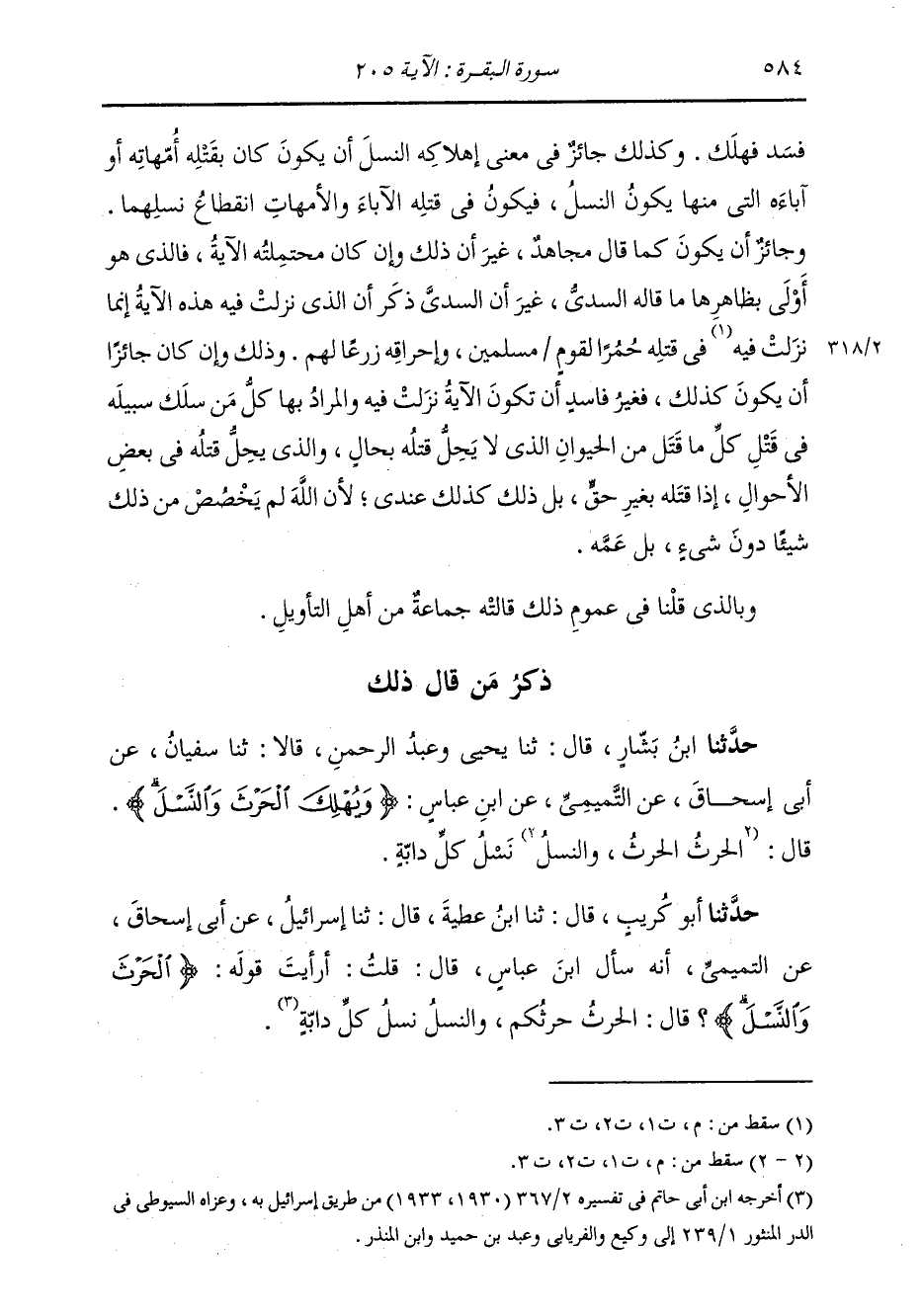 ذِكْرُ مَنْ قَالَ ذَلِكَ حَدَّثَنَا ابْنُ بَشَّارٍ، قَالَ. ثنا يَحْيَى، وَعَبْدُ الرَّحْمَنِ، قَالَا: ثنا سُفْيَانُ، عَنْ أَبِي إِسْحَاقَ، عَنِ التَّمِيمِيِّ، أَنَّهُ سَأَلَ ابْنَ عَبَّاسٍ: " {§وَيُهْلِكَ الْحَرْثَ وَالنَّسْلَ} [البقرة: 205] قَالَ: نَسْلُ كُلِّ دَابَّةٍ "