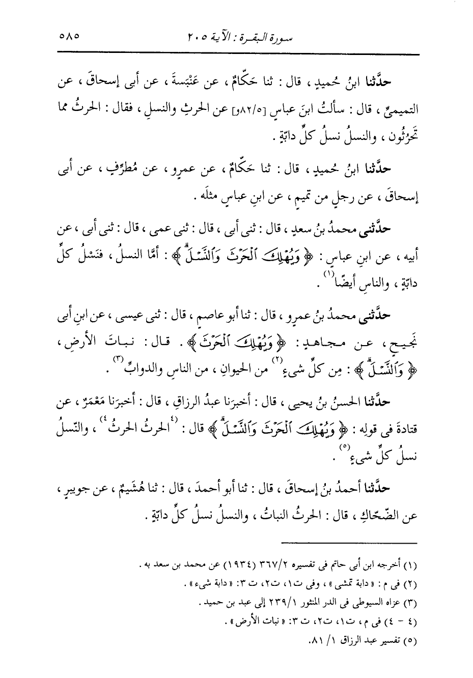 حَدَّثَنَا ابْنُ حُمَيْدٍ قَالَ: ثنا حَكَّامٌ، عَنْ عَنْبَسَةَ، عَنْ أَبِي إِسْحَاقَ، عَنِ التَّمِيمِيِّ، قَالَ: سَأَلْتُ ابْنَ عَبَّاسٍ عَنِ الْحَرْثِ، وَالنَّسْلِ، فَقَالَ: " §الْحَرْثُ: مِمَّا تَحْرُثُونَ، وَالنَّسْلُ: نَسْلُ كُلِّ دَابَّةٍ " حَدَّثَنَا ابْنُ حُمَيْدٍ، قَالَ. ثنا حَكَّامٌ، عَنْ عَمْرٍو، عَنْ مُطَرِّفٍ، عَنْ أَبِي إِسْحَاقَ، عَنْ رَجُلٍ مِنْ تَمِيمٍ، عَنِ ابْنِ عَبَّاسٍ، مِثْلَهُ