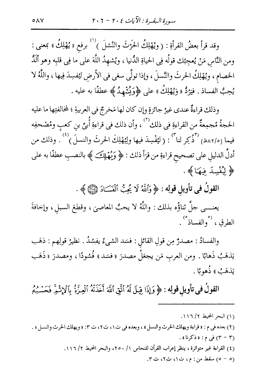 وَقَدْ قَرَأَ بَعْضُ الْقُرَّاءِ: (وَيُهْلِكُ الْحَرْثَ وَالنَّسْلَ) بِرَفْعِ «يُهْلِكُ» عَلَى مَعْنَى: وَمِنَ النَّاسِ مَنْ يُعْجِبُكَ قَوْلُهُ فِي الْحَيَاةِ الدُّنْيَا وَيُشْهِدُ اللَّهَ عَلَى مَا فِي قَلْبِهِ وَهُوَ أَلَدُّ الْخِصَامِ، وَيُهْلِكُ الْحَرْثَ وَالنَّسْلَ، وَإِذَا تَوَلَّى سَعَى فِي الْأَرْضِ لِيُفْسِدَ فِيهَا وَاللَّهُ لَا يَجِبُ الْفَسَادَ. فَيَرُدُّ «وَيُهْلِكُ» عَلَى «وَيَشْهَدُ اللَّهَ» عَطْفًا بِهِ عَلَيْهِ. وَذَلِكَ قِرَاءَةٌ عِنْدِي غَيْرُ جَائِزَةٍ وَإِنْ كَانَ لَهَا مَخْرَجٌ فِي الْعَرَبِيَّةِ لِمُخَالَفَتِهَا لِمَا عَلَيْهِ الْحُجَّةُ مُجْمِعَةٌ مِنَ الْقِرَاءَةِ فِي ذَلِكَ قِرَاءَةَ: {وَيُهْلِكَ الْحَرْثَ وَالنَّسْلَ} [البقرة: 205] وَأَنَّ ذَلِكَ فِي قِرَاءَةِ أُبَيِّ بْنِ كَعْبٍ، وَمُصْحَفِهِ فِيمَا ذُكِرَ لَنَا: لِيُفْسِدَ فِيهَا وَلِيُهْلِكَ الْحَرْثَ وَالنَّسْلَ "، وَذَلِكَ مِنْ أَدَلِّ الدَّلِيلِ عَلَى تَصْحِيحِ قِرَاءَةِ مَنْ قَرَأَ ذَلِكَ {وَيُهْلِكَ} [البقرة: 205] بِالنَّصْبِ عَطْفًا بِهِ عَلَى: {لِيُفْسِدَ فِيهَا} [البقرة: 205]