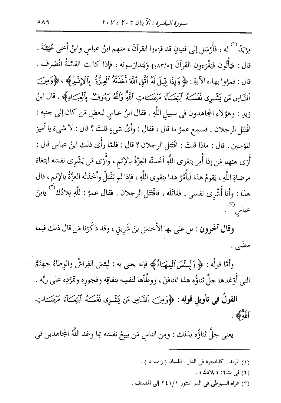 §الْقَوْلُ فِي تَأْوِيلِ قَوْلِهِ تَعَالَى: {وَمِنَ النَّاسِ مِنْ يَشْرِي نَفْسَهُ ابْتِغَاءَ مَرْضَاتِ اللَّهِ} [البقرة: 207] يَعْنِي جَلَّ ثَنَاؤُهُ: وَمِنَ النَّاسِ مَنْ يَبِيعُ نَفْسَهُ بِمَا وَعَدَ اللَّهُ الْمُجَاهِدِينَ فِي -[590]- سَبِيلِهِ وَابْتَاعَ بِهِ أَنْفُسَهُمْ بِقَوْلِهِ: {إِنَّ اللَّهَ اشْتَرَى مِنَ الْمُؤْمِنِينَ أَنْفُسَهُمْ وَأَمْوَالَهُمْ بِأَنَّ لَهُمُ الْجَنَّةَ} [التوبة: 111] وَقَدْ دَلَّلْنَا عَلَى أَنَّ مَعْنَى شَرَى بَاعَ فِي غَيْرِ هَذَا الْمَوْضِعِ بِمَا أَغْنَى عَنْ إِعَادَتِهِ.
