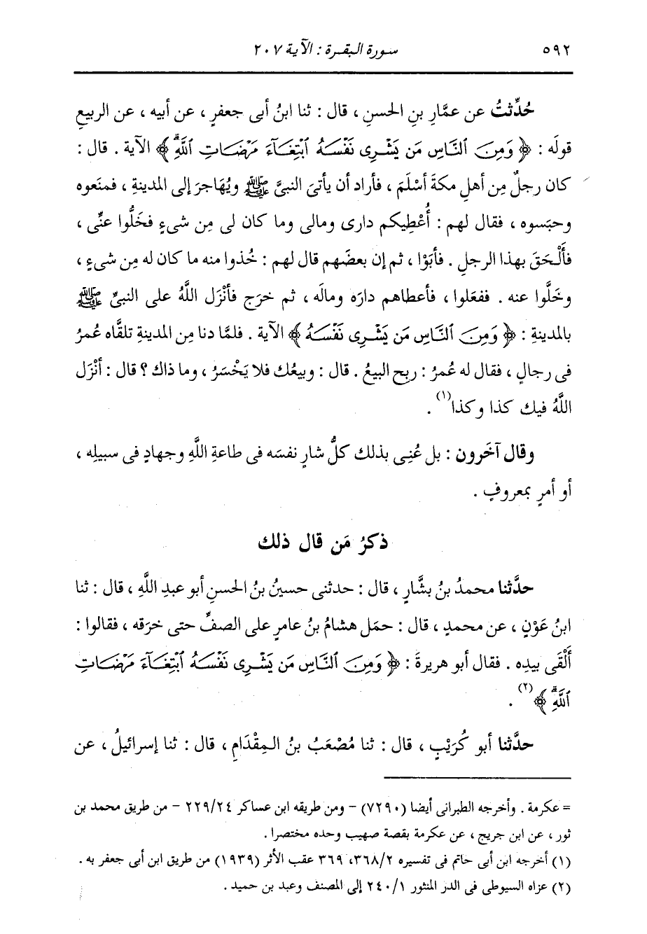 حُدِّثْتُ عَنْ عَمَّارٍ، قَالَ: ثنا ابْنُ أَبِي جَعْفَرٍ، عَنْ أَبِيهِ، عَنِ الرَّبِيعِ، قَوْلِهِ: " {§وَمِنَ النَّاسِ مَنْ يَشْرِي نَفْسَهُ ابْتِغَاءَ مَرْضَاتِ اللَّهِ} [البقرة: 207] الْآيَةَ، قَالَ: كَانَ رَجُلٌ مِنْ أَهْلِ مَكَّةَ أَسْلَمَ، فَأَرَادَ أَنْ يَأْتِيَ النَّبِيَّ صَلَّى اللهُ عَلَيْهِ وَسَلَّمَ وَيُهَاجِرَ إِلَى الْمَدِينَةِ، فَمَنَعُوهُ، وَحَبَسُوهُ، فَقَالَ لَهُمْ: أُعْطِيكُمْ دَارِي، وَمَالِي وَمَا كَانَ لِي مِنْ شَيْءٍ فَخَلُّوا عَنِّي فَأَلْحَقَ بِهَذَا الرَّجُلِ فَأَبَوْا. ثُمَّ إِنَّ بَعْضَهُمْ قَالَ لَهُمْ: خُذُوا مِنْهُ مَا كَانَ لَهُ مِنْ شَيْءٍ وَخَلُّوا عَنْهُ فَفَعَلُوا، فَأَعْطَاهُمْ دَارَهُ وَمَالَهُ، ثُمَّ خَرَجَ؛ فَأَنْزَلَ اللَّهُ عَزَّ وَجَلَّ عَلَى النَّبِيِّ صَلَّى اللهُ عَلَيْهِ وَسَلَّمَ بِالْمَدِينَةِ: {وَمِنَ النَّاسِ مَنْ يَشْرِي نَفْسَهُ ابْتِغَاءَ مَرْضَاتِ اللَّهِ} [البقرة: 207] الْآيَةَ؛ فَلَمَّا دَنَا مِنَ الْمَدِينَةِ تَلَقَّاهُ عُمَرُ، فِي رِجَالٍ، فَقَالَ لَهُ عُمَرُ: رَبِحَ الْبَيْعُ، قَالَ: وَبَيْعُكَ فَلَا يَخْسَرُ، قَالَ: وَمَا ذَاكَ؟ قَالَ: أُنْزِلَ فِيكَ كَذَا وَكَذَا " وَقَالَ آخَرُونَ: بَلْ عَنَى بِذَلِكَ كُلَّ شارٍ نَفْسَهُ فِي طَاعَةِ اللَّهِ، وَجِهَادٍ فِي سَبِيلِهِ، أَوْ أَمْرٍ بِمَعْرُوفٍ