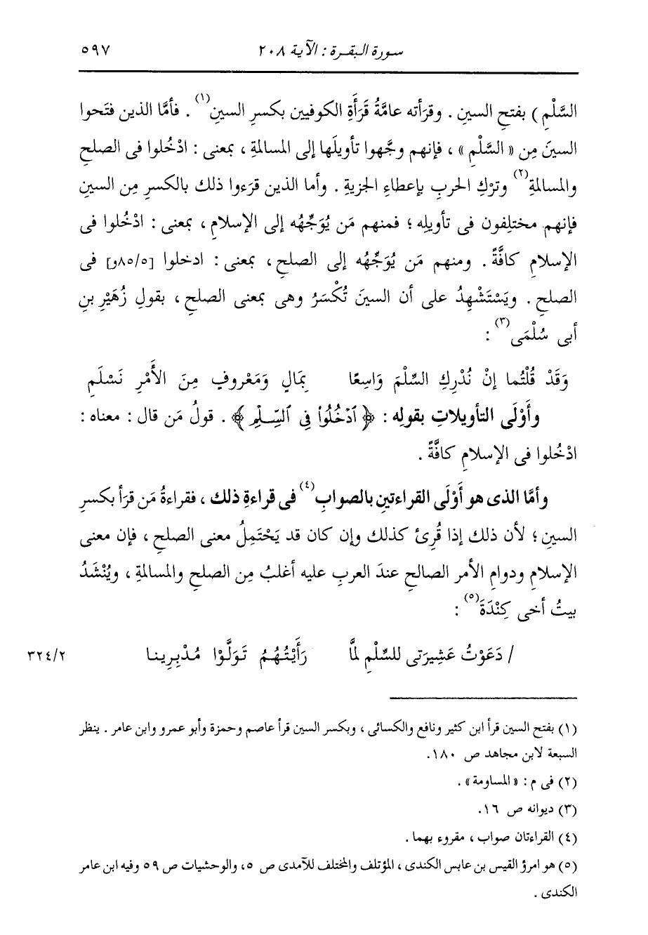 وَأَوْلَى التَّأْوِيلَاتِ بِقَوْلِهِ: {ادْخُلُوا فِي السِّلْمِ} [البقرة: 208] قَوْلُ مَنْ قَالَ: مَعْنَاهُ: ادْخُلُوا فِي الْإِسْلَامِ كَافَّةً وَأَمَّا الَّذِي هُوَ أَوْلَى الْقِرَاءَتَيْنِ بِالصَّوَابِ فِي قِرَاءَةِ ذَلِكَ، فَقِرَاءَةُ مَنْ قَرَأَ بِكَسْرِ السِّينِ؛ لِأَنَّ ذَلِكَ إِذَا قُرِئَ كَذَلِكَ وَإِنْ كَانَ قَدْ يَحْتَمِلُ مَعْنَى الصُّلْحِ، فَإِنَّ مَعْنَى الْإِسْلَامِ: وَدَوَامِ الْأَمْرِ الصَّالِحِ عِنْدَ الْعَرَبِ أَغْلَبُ عَلَيْهِ مِنَ الصُّلْحِ، وَالْمُسَالَمَةِ، وَيُنْشِدُ بَيْتَ أَخِي كِنْدَةَ: