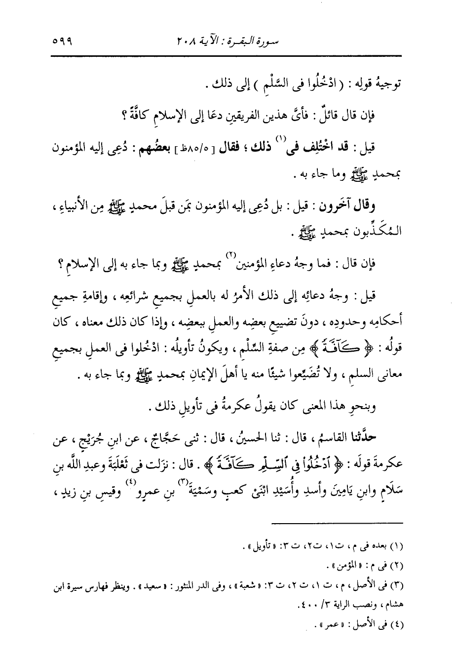 تَوْجِيهُ قَوْلِهِ: {ادْخُلُوا فِي السِّلْمِ} [البقرة: 208] إِلَى ذَلِكَ. فَإِنْ قَالَ لَنَا قَائِلٌ: فَأَيُّ هَذَيْنِ الْفَرِيقَيْنِ دُعِيَ إِلَى الْإِسْلَامِ كَافَّةً؟ قِيلَ قَدِ اخْتُلِفَ فِي تَأْوِيلِ ذَلِكَ، فَقَالَ بَعْضُهُمْ: دُعِيَ إِلَيْهِ الْمُؤْمِنُونَ بِمُحَمَّدٍ صَلَّى اللهُ عَلَيْهِ وَسَلَّمَ، وَمَا جَاءَ بِهِ. وَقَالَ آخَرُونَ: قِيلَ: دُعِيَ إِلَيْهِ الْمُؤْمِنُونَ بِمَنْ قَبْلَ مُحَمَّدٍ صَلَّى اللهُ عَلَيْهِ وَسَلَّمَ مِنَ الْأَنْبِيَاءِ الْمُكَذِّبُونَ بِمُحَمَّدٍ. فَإِنْ قَالَ: فَمَا وَجْهُ دُعَاءِ الْمُؤْمِنِ بِمُحَمَّدٍ وَبِمَا جَاءَ بِهِ إِلَى الْإِسْلَامِ؟ قِيلَ: وَجْهُ دُعَائِهِ إِلَى ذَلِكَ الْأَمْرُ لَهُ بِالْعَمَلِ بِجَمِيعِ شَرَائِعِهِ، وَإِقَامَةِ جَمِيعِ أَحْكَامِهِ، وَحُدُودِهِ، دُونَ تَضْيِيعِ بَعْضِهِ وَالْعَمَلِ بِبَعْضِهِ. وَإِذَا كَانَ ذَلِكَ مَعْنَاهُ، كَانَ قَوْلُهُ {كَافَّةً} [البقرة: 208] مِنْ صِفَةِ السَّلْمِ، وَيَكُونُ تَأْوِيلُهُ: ادْخُلُوا فِي الْعَمَلِ بِجَمِيعِ مَعَانِي السَّلْمِ، وَلَا تُضَيِّعُوا شَيْئًا مِنْهُ يَا أَهْلَ الْإِيمَانِ بِمُحَمَّدٍ وَمَا جَاءَ بِهِ. وَبِنَحْوِ هَذَا الْمَعْنَى كَانَ يَقُولُ عِكْرِمَةُ فِي تَأْوِيلِ ذَلِكَ