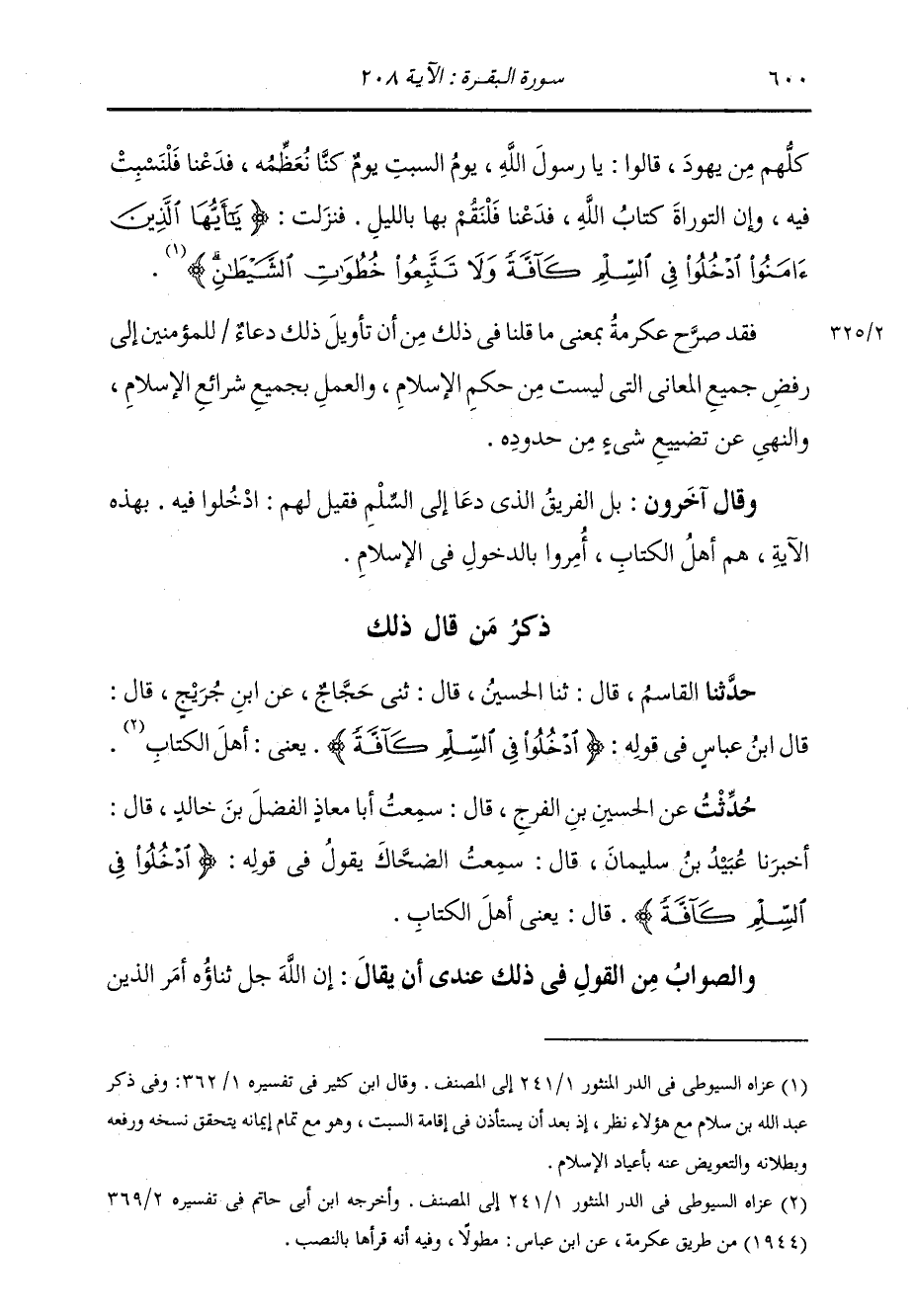 كُلُّهُمْ مِنْ يَهُودَ، قَالُوا: يَا رَسُولَ اللَّهِ، يَوْمَ السَّبْتِ يَوْمَ كُنَّا نُعَظِّمُهُ فَدَعْنَا فَلْنُسْبِتْ فِيهِ، وَإِنَّ التَّوْرَاةَ كِتَابُ اللَّهِ، فَدَعْنَا فَلْنَقُمْ بِهَا بِاللَّيْلَ فَنَزَلَتْ: {يَا أَيُّهَا الَّذِينَ آمَنُوا ادْخُلُوا فِي السِّلْمِ كَافَّةً وَلَا تَتَّبِعُوا خُطُوَاتِ الشَّيْطَانِ} [البقرة: 208] " فَقَدْ صَرَّحَ عِكْرِمَةُ، بِمَعْنَى مَا قُلْنَا فِي ذَلِكَ مِنْ أَنَّ تَأْوِيلَ ذَلِكَ دُعَاءٌ لِلْمُؤْمِنِينَ إِلَى رَفْضِ جَمِيعِ الْمَعَانِي الَّتِي لَيْسَتْ مِنْ حُكْمِ الْإِسْلَامِ، وَالْعَمَلُ بِجَمِيعِ شَرَائِعِ الْإِسْلَامِ، وَالنَّهْي عَنْ تَضْيِيعِ شَيْءٍ مِنْ حُدُودِهِ. وَقَالَ آخَرُونَ: بَلِ الْفَرِيقُ الَّذِي دُعِيَ إِلَى السِّلْمِ فَقِيلَ لَهُمُ ادْخُلُوا فِيهِ بِهَذِهِ الْآيَةِ هُمْ أَهْلُ الْكِتَابِ، أُمِرُوا بِالدُّخُولِ فِي الْإِسْلَامِ